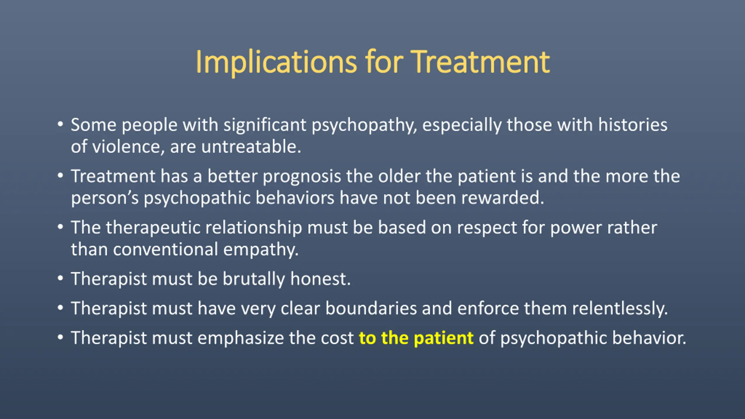 Implications for Treatment Implications for Treatment Some people with significant psychopathy, especially those with histories of violence, are untreatable. Treatment has a better prognosis the older the patient is and the more the person s psychopathic behaviors have not been rewarded. The therapeutic relationship must be based on respect for power rather than conventional empathy. Therapist must be brutally honest. Therapist must have very clear boundaries and enforce them relentlessly. Therapist must emphasize the cost to the patient of psychopathic behavior.