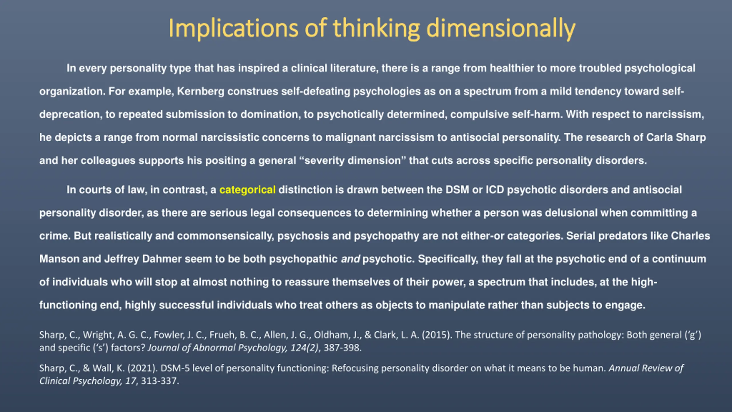 Implications of thinking dimensionally Implications of thinking dimensionally In every personality type that has inspired a clinical literature, there is a range from healthier to more troubled psychological organization. For example, Kernberg construes self-defeating psychologies as on a spectrum from a mild tendency toward self- deprecation, to repeated submission to domination, to psychotically determined, compulsive self-harm. With respect to narcissism, he depicts a range from normal narcissistic concerns to malignant narcissism to antisocial personality. The research of Carla Sharp and her colleagues supports his positing a general severity dimension that cuts across specific personality disorders. In courts of law, in contrast, a categorical distinction is drawn between the DSM or ICD psychotic disorders and antisocial personality disorder, as there are serious legal consequences to determining whether a person was delusional when committing a crime. But realistically and commonsensically, psychosis and psychopathy are not either-or categories. Serial predators like Charles Manson and Jeffrey Dahmer seem to be both psychopathic and psychotic. Specifically, they fall at the psychotic end of a continuum of individuals who will stop at almost nothing to reassure themselves of their power, a spectrum that includes, at the high- functioning end, highly successful individuals who treat others as objects to manipulate rather than subjects to engage. Sharp, C., Wright, A. G. C., Fowler, J. C., Frueh, B. C., Allen, J. G., Oldham, J., & Clark, L. A. (2015). The structure of personality pathology: Both general ( g ) and specific ( s ) factors? Journal of Abnormal Psychology, 124(2), 387-398. Sharp, C., & Wall, K. (2021). DSM-5 level of personality functioning: Refocusing personality disorder on what it means to be human. Annual Review of Clinical Psychology, 17, 313-337.