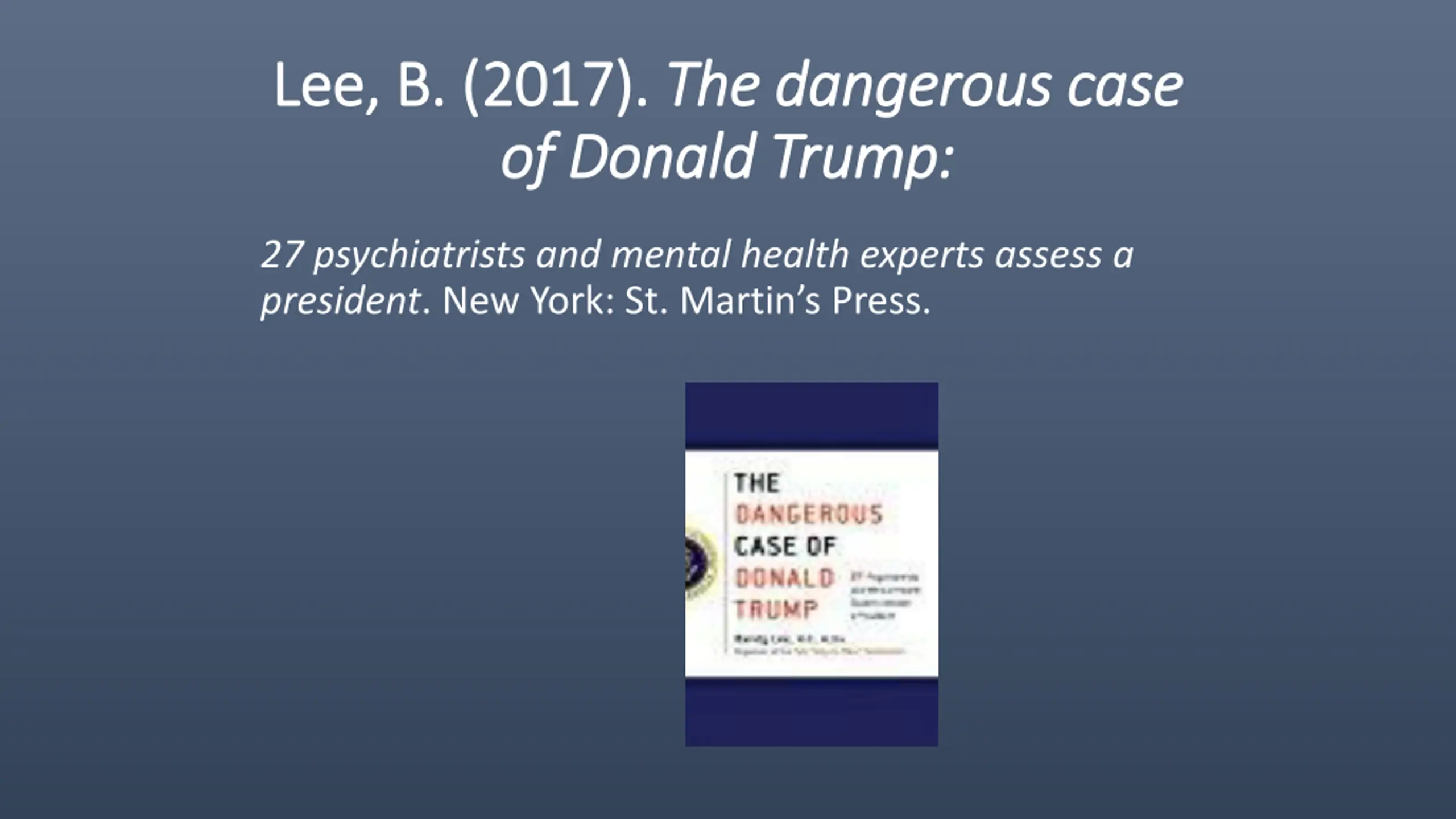 Lee, B. (2017). Lee, B. (2017). The dangerous case The dangerous case of Donald Trump: of Donald Trump: 27 psychiatrists and mental health experts assess a president. New York: St. Martin s Press.