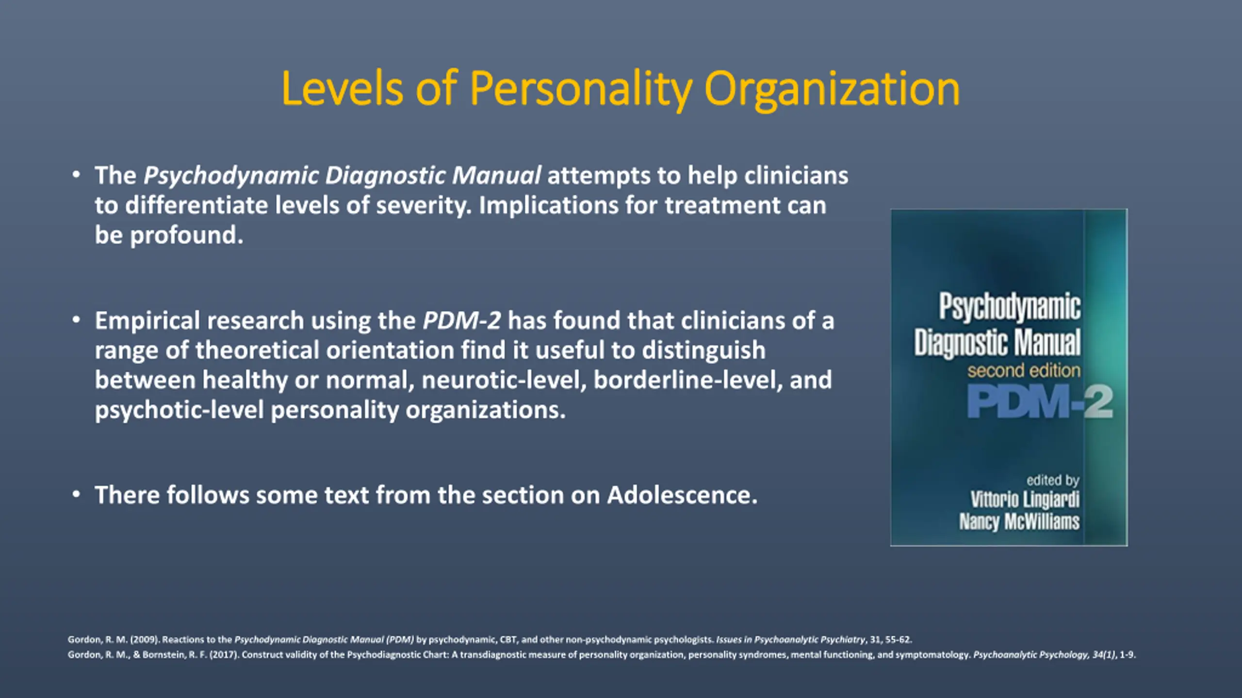 Levels of Personality Organization Levels of Personality Organization The Psychodynamic Diagnostic Manual attempts to help clinicians to differentiate levels of severity. Implications for treatment can be profound. Empirical research using the PDM-2 has found that clinicians of a range of theoretical orientation find it useful to distinguish between healthy or normal, neurotic-level, borderline-level, and psychotic-level personality organizations. There follows some text from the section on Adolescence. Gordon, R. M. (2009). Reactions to the Psychodynamic Diagnostic Manual (PDM) by psychodynamic, CBT, and other non-psychodynamic psychologists. Issues in Psychoanalytic Psychiatry, 31, 55-62. Gordon, R. M., & Bornstein, R. F. (2017). Construct validity of the Psychodiagnostic Chart: A transdiagnostic measure of personality organization, personality syndromes, mental functioning, and symptomatology. Psychoanalytic Psychology, 34(1), 1-9.