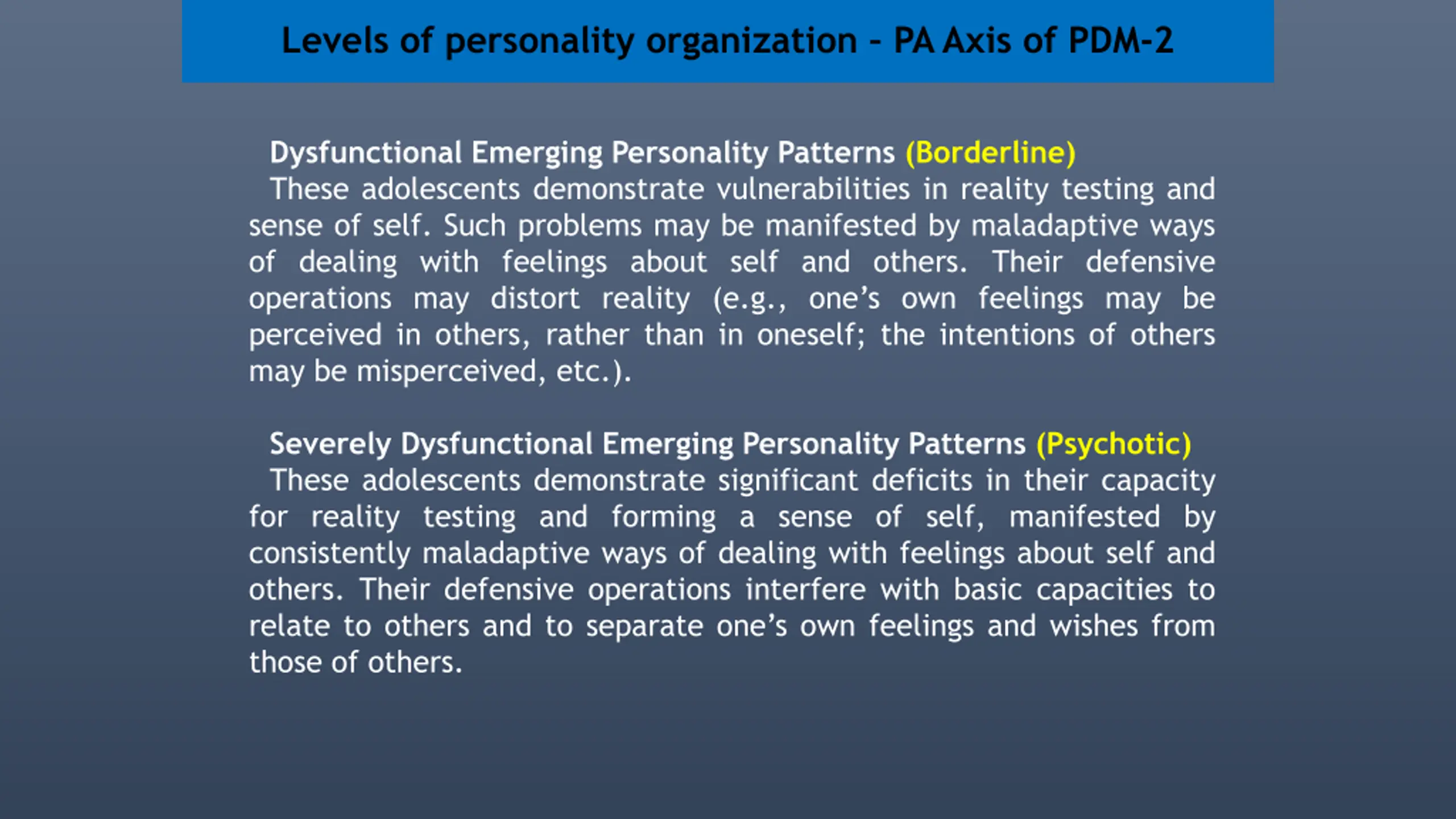 Levels of personality organization PA Axis of PDM-2 Dysfunctional Emerging Personality Patterns (Borderline) These adolescents demonstrate vulnerabilities in reality testing and sense of self. Such problems may be manifested by maladaptive ways of dealing with feelings about self and others. Their defensive operations may distort reality (e.g., one s own feelings may be perceived in others, rather than in oneself; the intentions of others may be misperceived, etc.). Severely Dysfunctional Emerging Personality Patterns (Psychotic) These adolescents demonstrate significant deficits in their capacity for reality testing and forming a sense of self, manifested by consistently maladaptive ways of dealing with feelings about self and others. Their defensive operations interfere with basic capacities to relate to others and to separate one s own feelings and wishes from those of others.