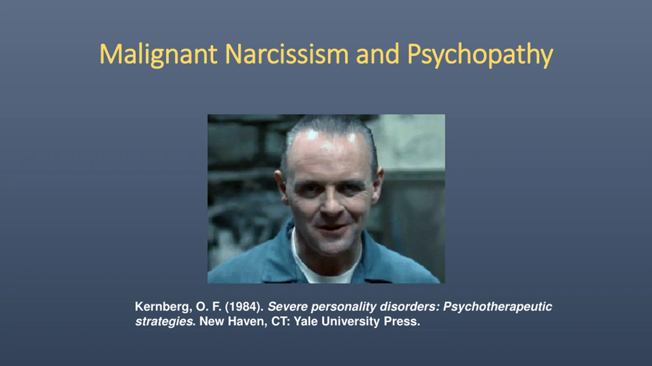 Malignant Narcissism and Psychopathy Malignant Narcissism and Psychopathy http://img1.wikia.nocookie.net/__cb20120114230704/villains/images/c/ca/Hannibal_Lecter.jpg Kernberg, O. F. (1984). Severe personality disorders: Psychotherapeutic strategies. New Haven, CT: Yale University Press.