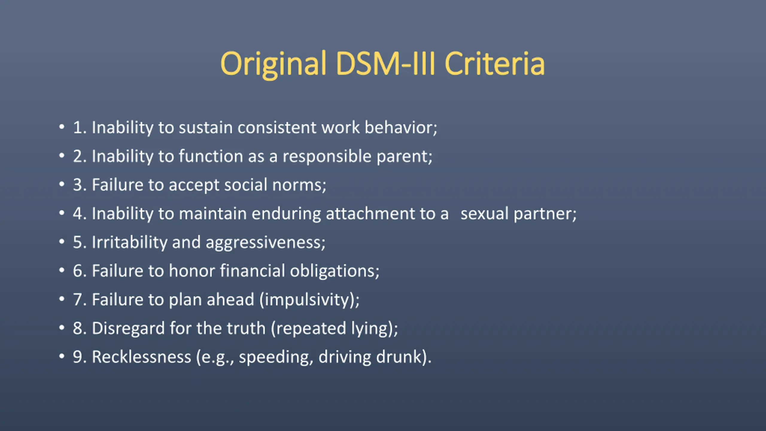 Original DSM Original DSM- -III Criteria III Criteria 1. Inability to sustain consistent work behavior; 2. Inability to function as a responsible parent; 3. Failure to accept social norms; 4. Inability to maintain enduring attachment to a sexual partner; 5. Irritability and aggressiveness; 6. Failure to honor financial obligations; 7. Failure to plan ahead (impulsivity); 8. Disregard for the truth (repeated lying); 9. Recklessness (e.g., speeding, driving drunk).