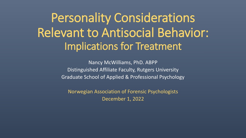 Personality Considerations Personality Considerations Relevant to Antisocial Behavior: Relevant to Antisocial Behavior: Implications for Treatment Implications for Treatment Nancy McWilliams, PhD. ABPP Distinguished Affiliate Faculty, Rutgers University Graduate School of Applied & Professional Psychology Norwegian Association of Forensic Psychologists December 1, 2022