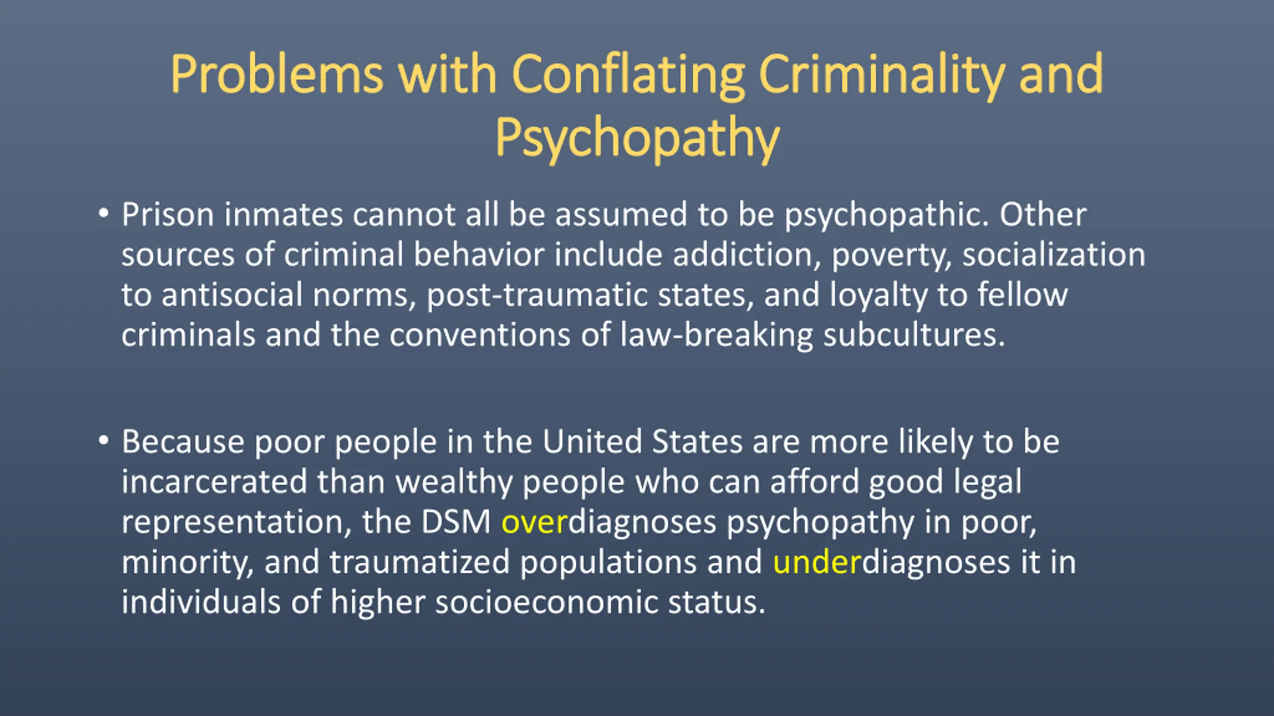 Problems with Conflating Criminality and Problems with Conflating Criminality and Psychopathy Psychopathy Prison inmates cannot all be assumed to be psychopathic. Other sources of criminal behavior include addiction, poverty, socialization to antisocial norms, post-traumatic states, and loyalty to fellow criminals and the conventions of law-breaking subcultures. Because poor people in the United States are more likely to be incarcerated than wealthy people who can afford good legal representation, the DSM overdiagnoses psychopathy in poor, minority, and traumatized populations and underdiagnoses it in individuals of higher socioeconomic status.