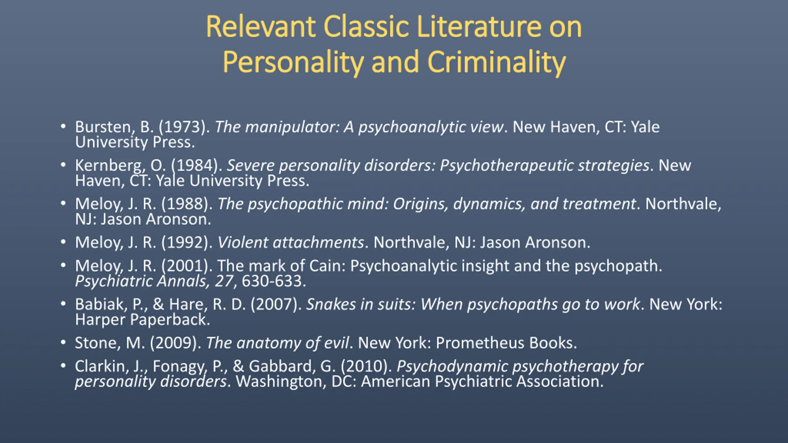Relevant Classic Literature on Relevant Classic Literature on Personality and Criminality Personality and Criminality Bursten, B. (1973). The manipulator: A psychoanalytic view. New Haven, CT: Yale University Press. Kernberg, O. (1984). Severe personality disorders: Psychotherapeutic strategies. New Haven, CT: Yale University Press. Meloy, J. R. (1988). The psychopathic mind: Origins, dynamics, and treatment. Northvale, NJ: Jason Aronson. Meloy, J. R. (1992). Violent attachments. Northvale, NJ: Jason Aronson. Meloy, J. R. (2001). The mark of Cain: Psychoanalytic insight and the psychopath. Psychiatric Annals, 27, 630-633. Babiak, P., & Hare, R. D. (2007). Snakes in suits: When psychopaths go to work. New York: Harper Paperback. Stone, M. (2009). The anatomy of evil. New York: Prometheus Books. Clarkin, J., Fonagy, P., & Gabbard, G. (2010). Psychodynamic psychotherapy for personality disorders. Washington, DC: American Psychiatric Association.