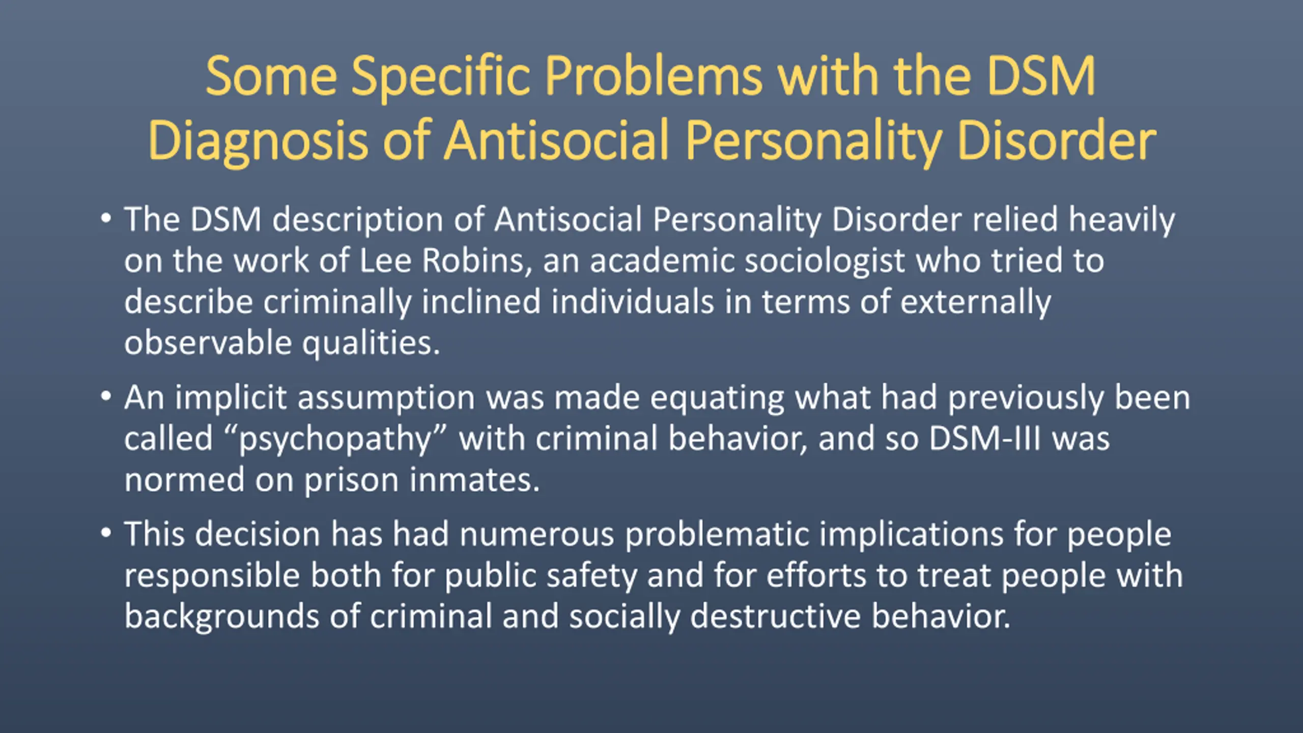 Some Specific Problems with the DSM Some Specific Problems with the DSM Diagnosis of Antisocial Personality Disorder Diagnosis of Antisocial Personality Disorder The DSM description of Antisocial Personality Disorder relied heavily on the work of Lee Robins, an academic sociologist who tried to describe criminally inclined individuals in terms of externally observable qualities. An implicit assumption was made equating what had previously been called psychopathy with criminal behavior, and so DSM-III was normed on prison inmates. This decision has had numerous problematic implications for people responsible both for public safety and for efforts to treat people with backgrounds of criminal and socially destructive behavior.