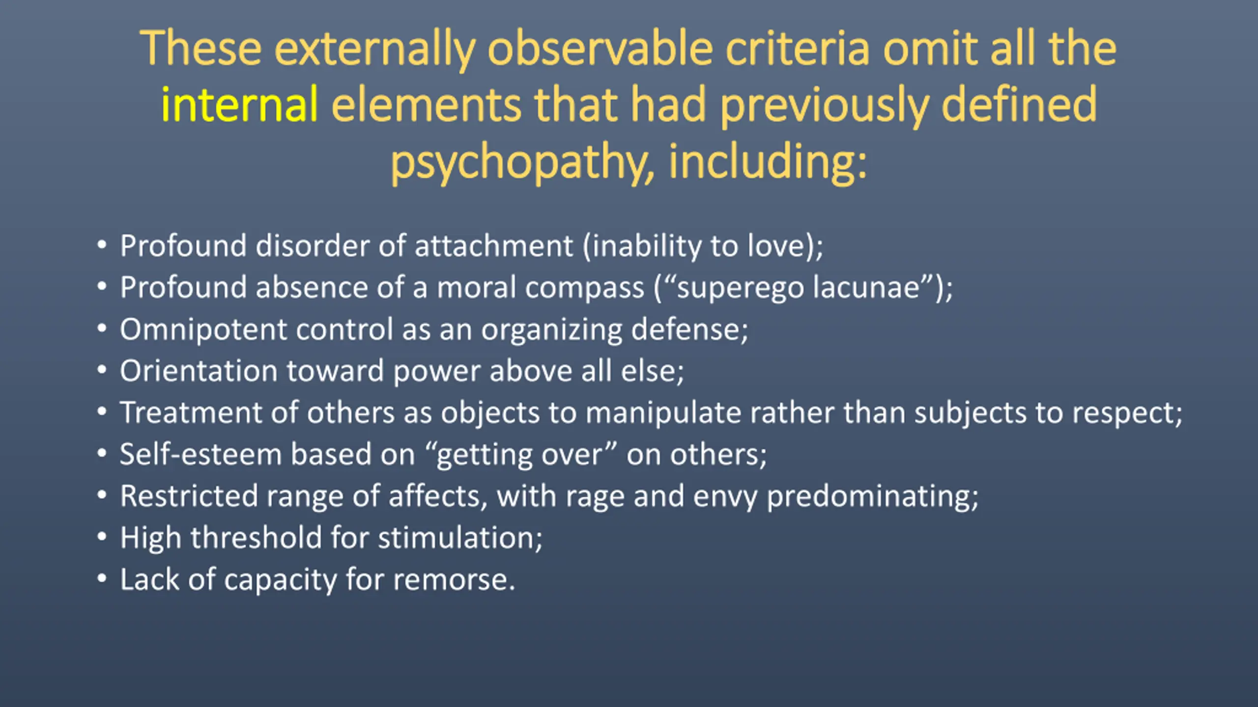 These externally observable criteria omit all the These externally observable criteria omit all the internal internal elements that had previously defined elements that had previously defined psychopathy, including: psychopathy, including: Profound disorder of attachment (inability to love); Profound absence of a moral compass ( superego lacunae ); Omnipotent control as an organizing defense; Orientation toward power above all else; Treatment of others as objects to manipulate rather than subjects to respect; Self-esteem based on getting over on others; Restricted range of affects, with rage and envy predominating; High threshold for stimulation; Lack of capacity for remorse.