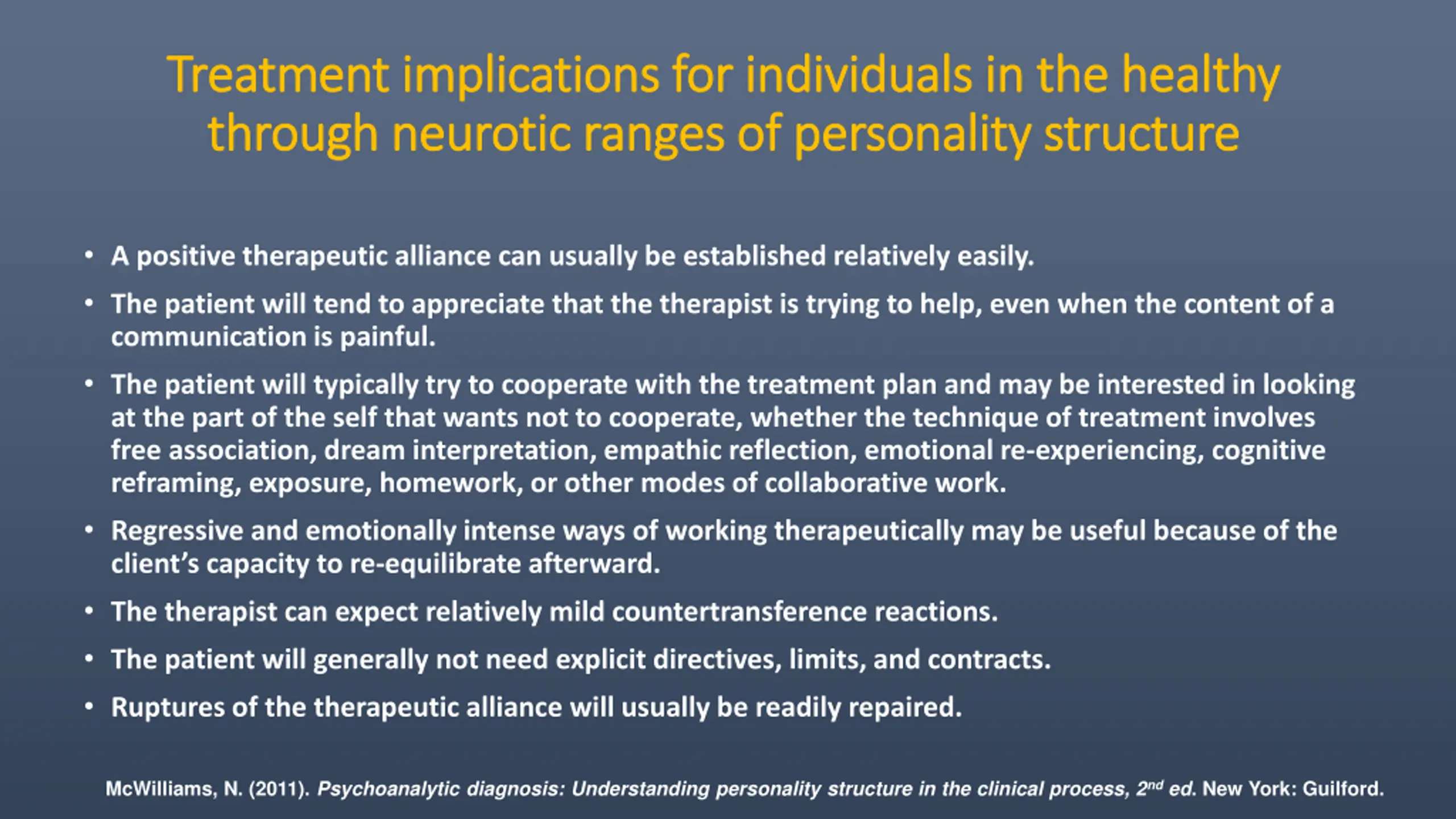 Treatment implications for individuals in the healthy Treatment implications for individuals in the healthy through neurotic ranges of personality structure through neurotic ranges of personality structure A positive therapeutic alliance can usually be established relatively easily. The patient will tend to appreciate that the therapist is trying to help, even when the content of a communication is painful. The patient will typically try to cooperate with the treatment plan and may be interested in looking at the part of the self that wants not to cooperate, whether the technique of treatment involves free association, dream interpretation, empathic reflection, emotional re-experiencing, cognitive reframing, exposure, homework, or other modes of collaborative work. Regressive and emotionally intense ways of working therapeutically may be useful because of the client s capacity to re-equilibrate afterward. The therapist can expect relatively mild countertransference reactions. The patient will generally not need explicit directives, limits, and contracts. Ruptures of the therapeutic alliance will usually be readily repaired. McWilliams, N. (2011). Psychoanalytic diagnosis: Understanding personality structure in the clinical process, 2nd ed. New York: Guilford.