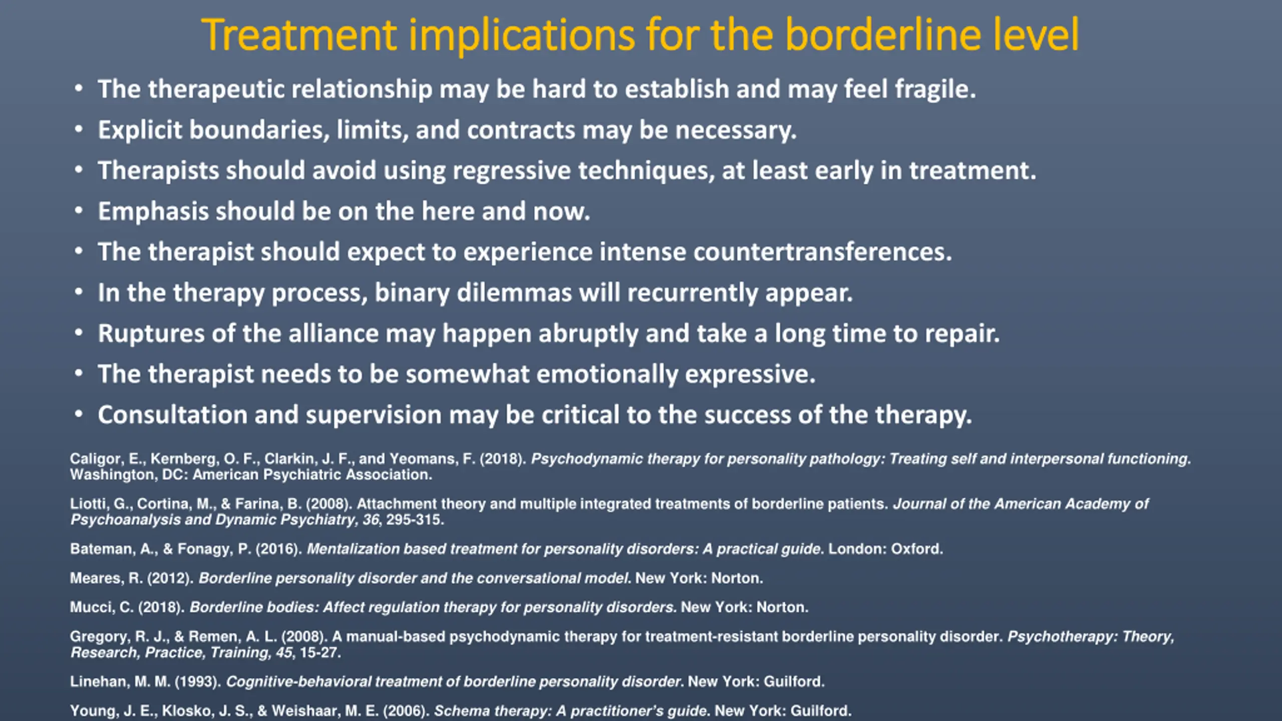 Treatment implications for the borderline level Treatment implications for the borderline level The therapeutic relationship may be hard to establish and may feel fragile. Explicit boundaries, limits, and contracts may be necessary. Therapists should avoid using regressive techniques, at least early in treatment. Emphasis should be on the here and now. The therapist should expect to experience intense countertransferences. In the therapy process, binary dilemmas will recurrently appear. Ruptures of the alliance may happen abruptly and take a long time to repair. The therapist needs to be somewhat emotionally expressive. Consultation and supervision may be critical to the success of the therapy. Caligor, E., Kernberg, O. F., Clarkin, J. F., and Yeomans, F. (2018). Psychodynamic therapy for personality pathology: Treating self and interpersonal functioning. Washington, DC: American Psychiatric Association. Liotti, G., Cortina, M., & Farina, B. (2008). Attachment theory and multiple integrated treatments of borderline patients. Journal of the American Academy of Psychoanalysis and Dynamic Psychiatry, 36, 295-315. Bateman, A., & Fonagy, P. (2016). Mentalization based treatment for personality disorders: A practical guide. London: Oxford. Meares, R. (2012). Borderline personality disorder and the conversational model. New York: Norton. Mucci, C. (2018). Borderline bodies: Affect regulation therapy for personality disorders. New York: Norton. Gregory, R. J., & Remen, A. L. (2008). A manual-based psychodynamic therapy for treatment-resistant borderline personality disorder. Psychotherapy: Theory, Research, Practice, Training, 45, 15-27. Linehan, M. M. (1993). Cognitive-behavioral treatment of borderline personality disorder. New York: Guilford. Young, J. E., Klosko, J. S., & Weishaar, M. E. (2006). Schema therapy: A practitioner s guide. New York: Guilford.