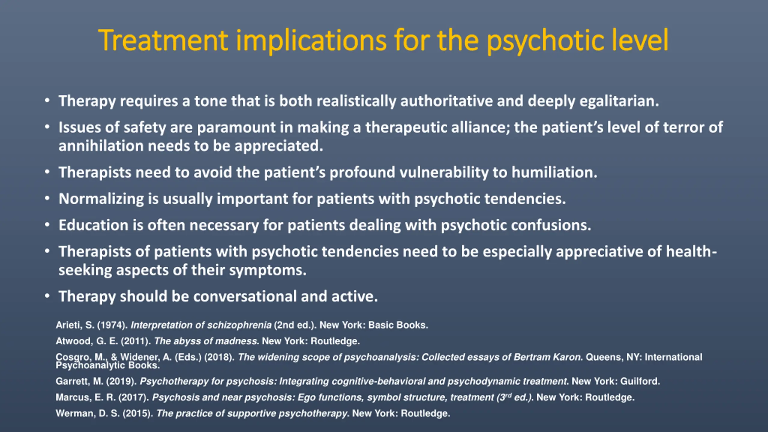 Treatment implications for the psychotic level Treatment implications for the psychotic level Therapy requires a tone that is both realistically authoritative and deeply egalitarian. Issues of safety are paramount in making a therapeutic alliance; the patient s level of terror of annihilation needs to be appreciated. Therapists need to avoid the patient s profound vulnerability to humiliation. Normalizing is usually important for patients with psychotic tendencies. Education is often necessary for patients dealing with psychotic confusions. Therapists of patients with psychotic tendencies need to be especially appreciative of health- seeking aspects of their symptoms. Therapy should be conversational and active. Arieti, S. (1974). Interpretation of schizophrenia (2nd ed.). New York: Basic Books. Atwood, G. E. (2011). The abyss of madness. New York: Routledge. Cosgro, M., & Widener, A. (Eds.) (2018). The widening scope of psychoanalysis: Collected essays of Bertram Karon. Queens, NY: International Psychoanalytic Books. Garrett, M. (2019). Psychotherapy for psychosis: Integrating cognitive-behavioral and psychodynamic treatment. New York: Guilford. Marcus, E. R. (2017). Psychosis and near psychosis: Ego functions, symbol structure, treatment (3rd ed.). New York: Routledge. Werman, D. S. (2015). The practice of supportive psychotherapy. New York: Routledge.