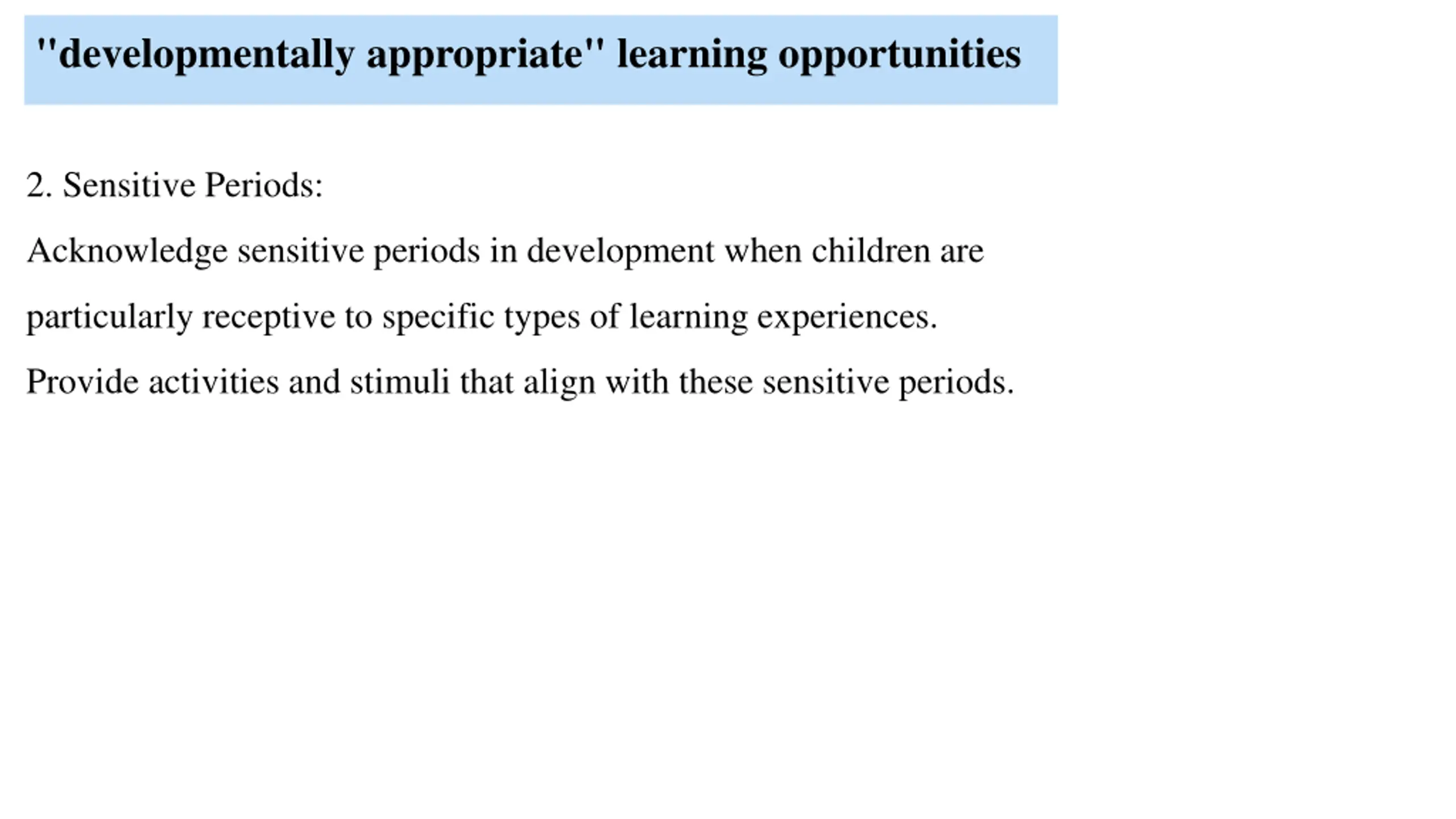 "developmentally appropriate" learning opportunities 2. Sensitive Periods: Acknowledge sensitive periods in development when children are particularly receptive to specific types of learning experiences. Provide activities and stimuli that align with these sensitive periods.