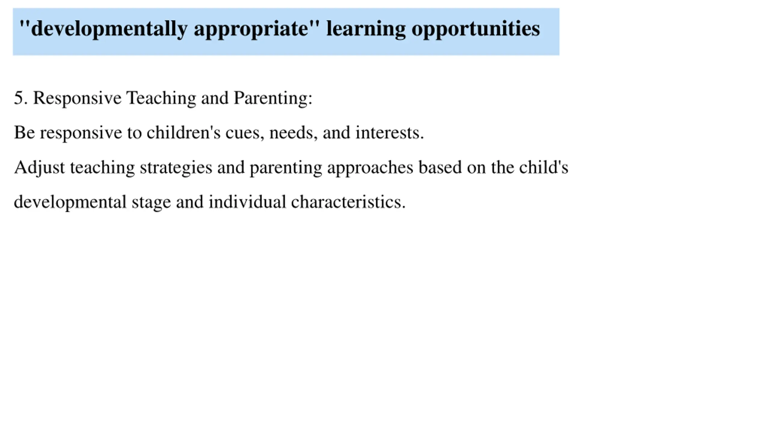 "developmentally appropriate" learning opportunities 5. Responsive Teaching and Parenting: Be responsive to children's cues, needs, and interests. Adjust teaching strategies and parenting approaches based on the child's developmental stage and individual characteristics.