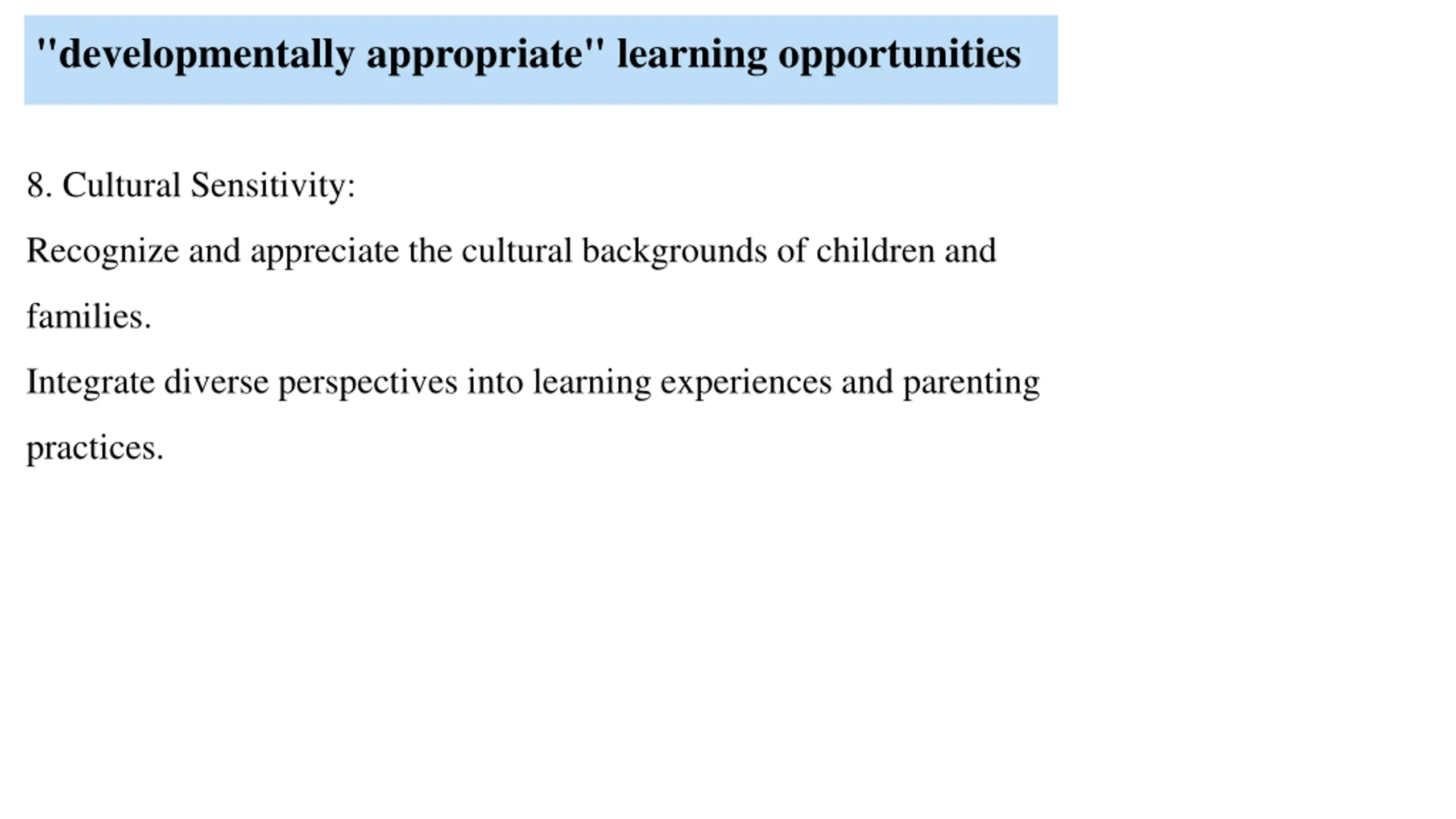 "developmentally appropriate" learning opportunities 8. Cultural Sensitivity: Recognize and appreciate the cultural backgrounds of children and families. Integrate diverse perspectives into learning experiences and parenting practices.