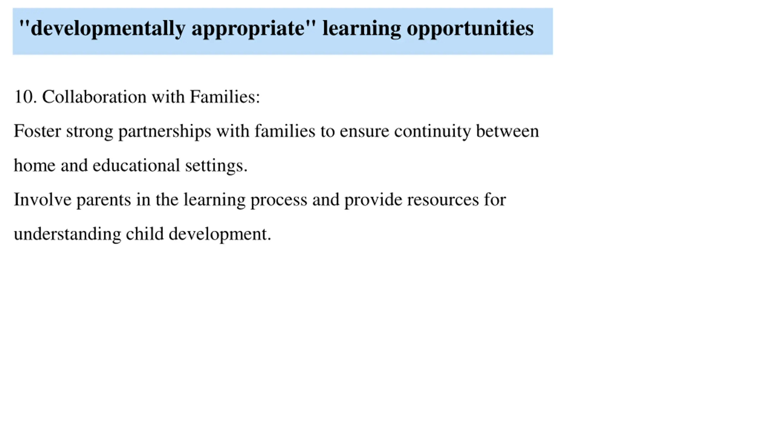 "developmentally appropriate" learning opportunities 10. Collaboration with Families: Foster strong partnerships with families to ensure continuity between home and educational settings. Involve parents in the learning process and provide resources for understanding child development.