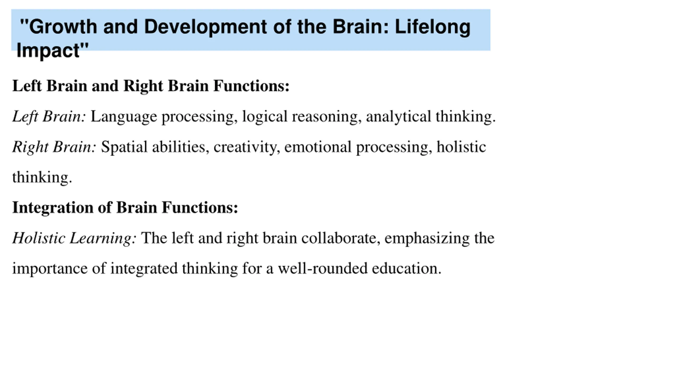 "Growth and Development of the Brain: Lifelong Impact" Left Brain and Right Brain Functions: Left Brain: Language processing, logical reasoning, analytical thinking. Right Brain: Spatial abilities, creativity, emotional processing, holistic thinking. Integration of Brain Functions: Holistic Learning: The left and right brain collaborate, emphasizing the importance of integrated thinking for a well-rounded education.