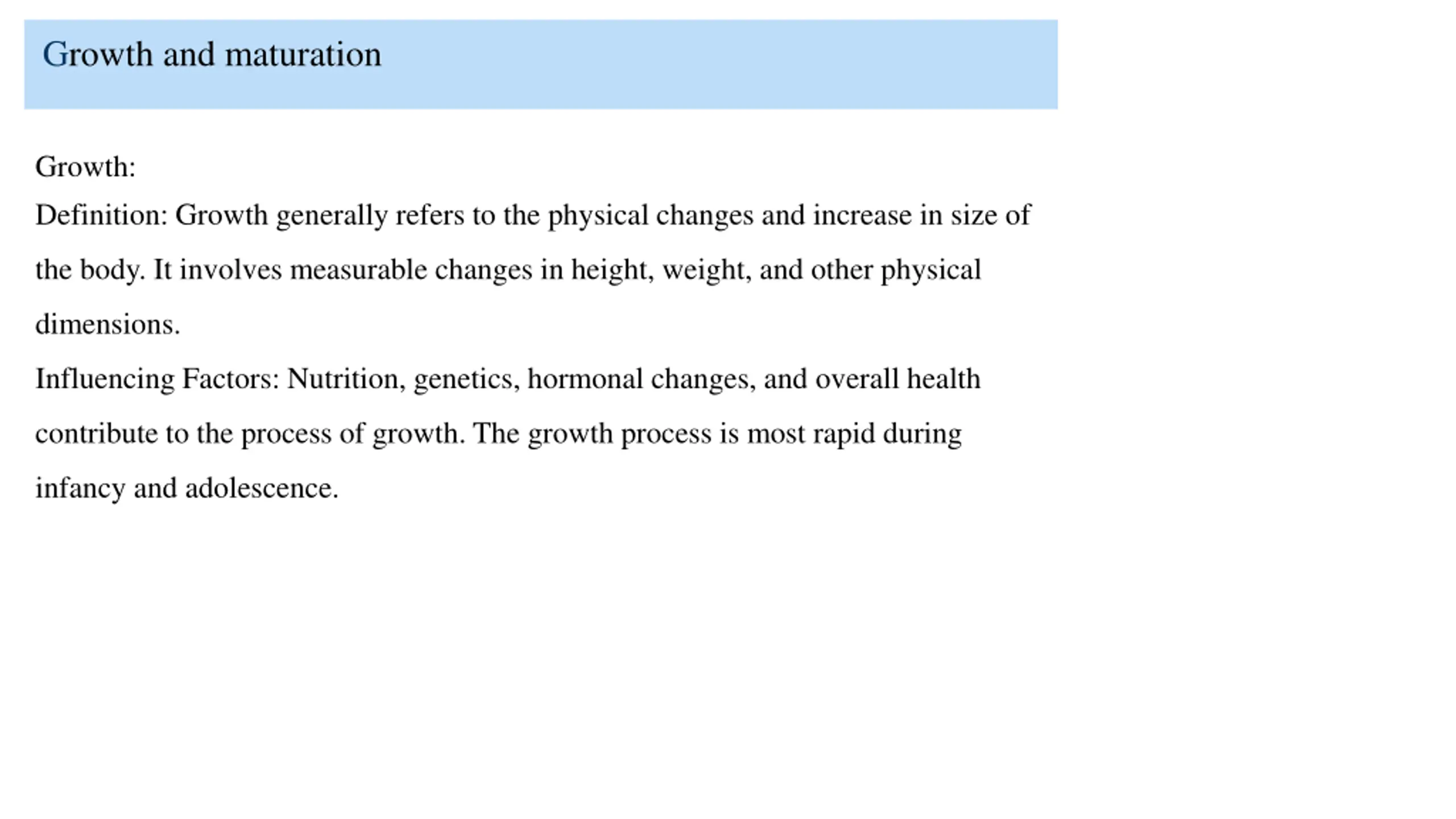Growth and maturation Growth: Definition: Growth generally refers to the physical changes and increase in size of the body. It involves measurable changes in height, weight, and other physical dimensions. Influencing Factors: Nutrition, genetics, hormonal changes, and overall health contribute to the process of growth. The growth process is most rapid during infancy and adolescence.