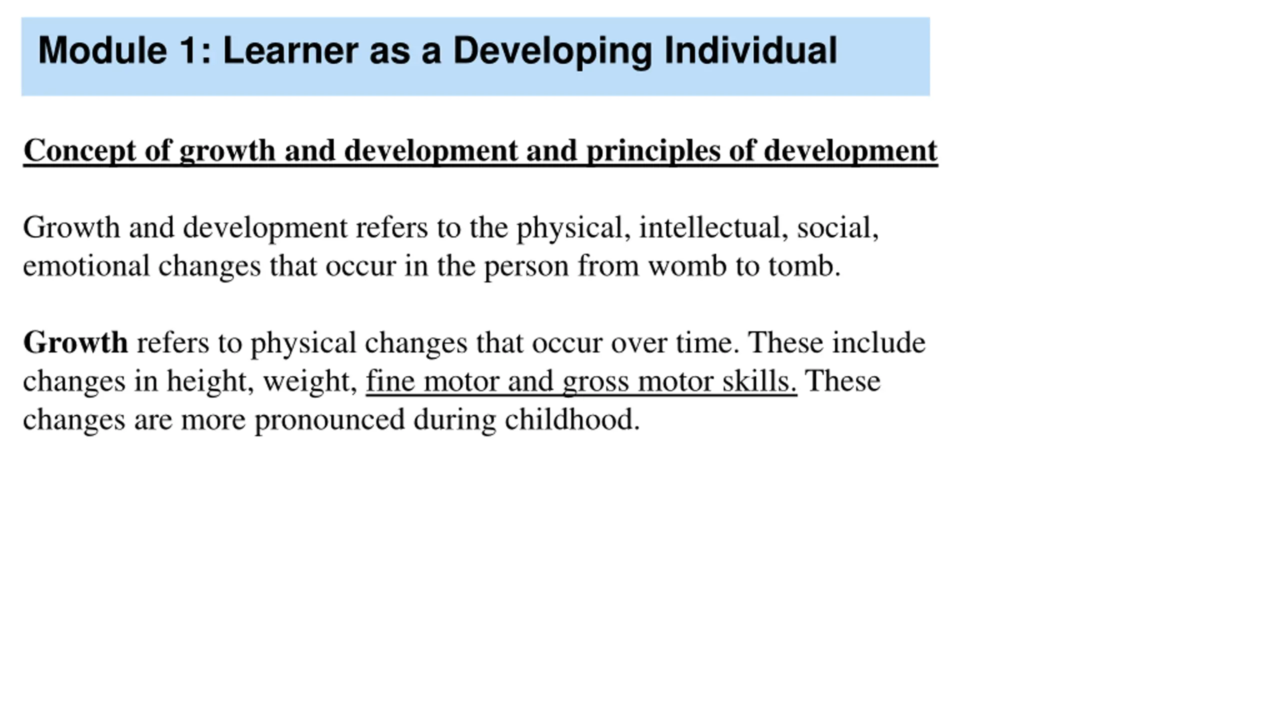 Module 1: Learner as a Developing Individual Concept of growth and development and principles of development Growth and development refers to the physical, intellectual, social, emotional changes that occur in the person from womb to tomb. Growth refers to physical changes that occur over time. These include changes in height, weight, fine motor and gross motor skills. These changes are more pronounced during childhood.