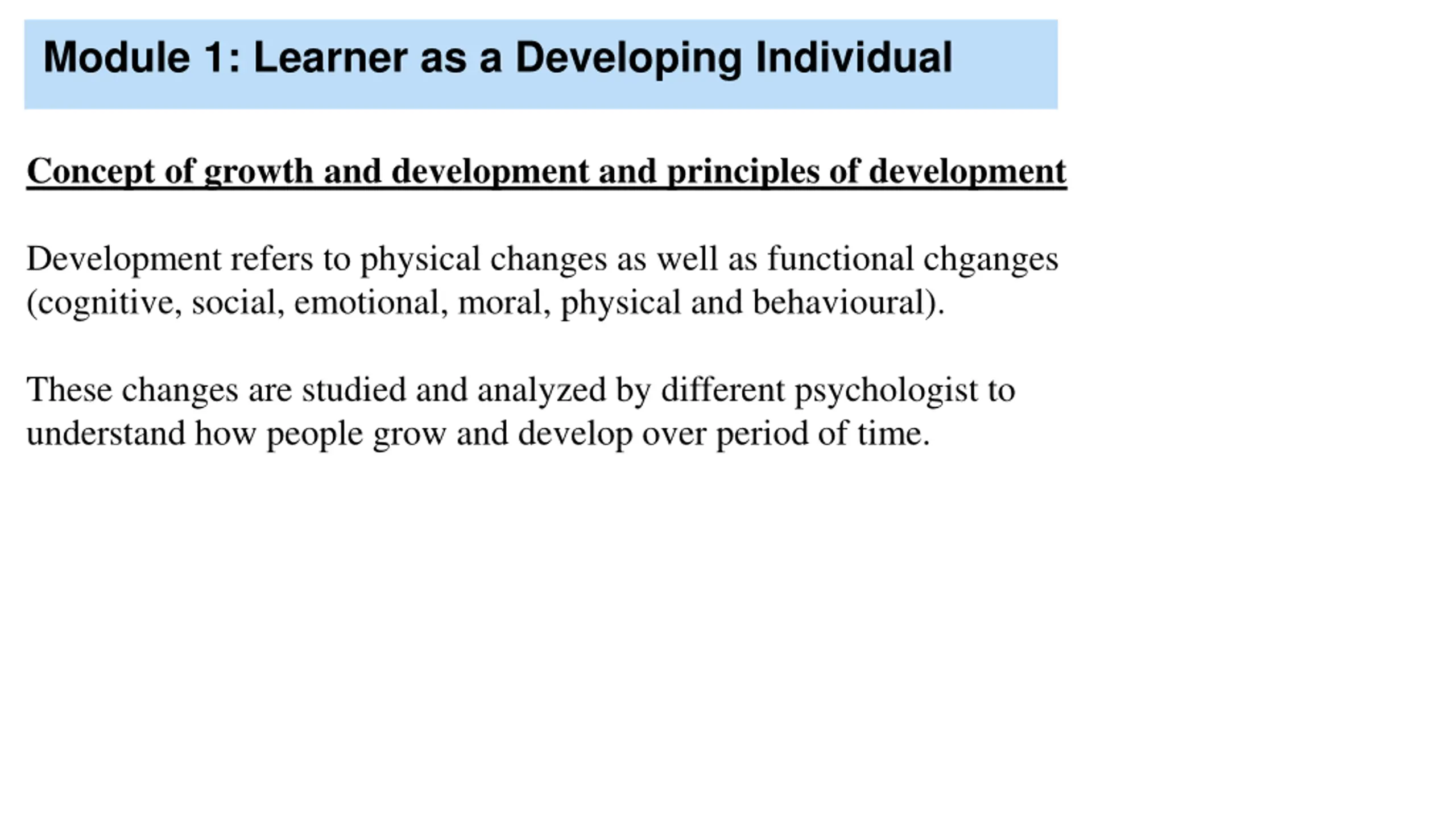 Module 1: Learner as a Developing Individual Concept of growth and development and principles of development Development refers to physical changes as well as functional chganges (cognitive, social, emotional, moral, physical and behavioural). These changes are studied and analyzed by different psychologist to understand how people grow and develop over period of time.