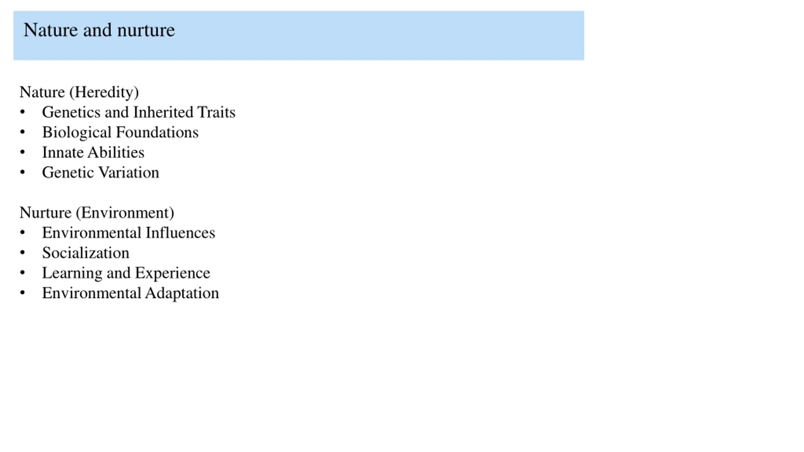 Nature and nurture Nature (Heredity) Genetics and Inherited Traits Biological Foundations Innate Abilities Genetic Variation Nurture (Environment) Environmental Influences Socialization Learning and Experience Environmental Adaptation