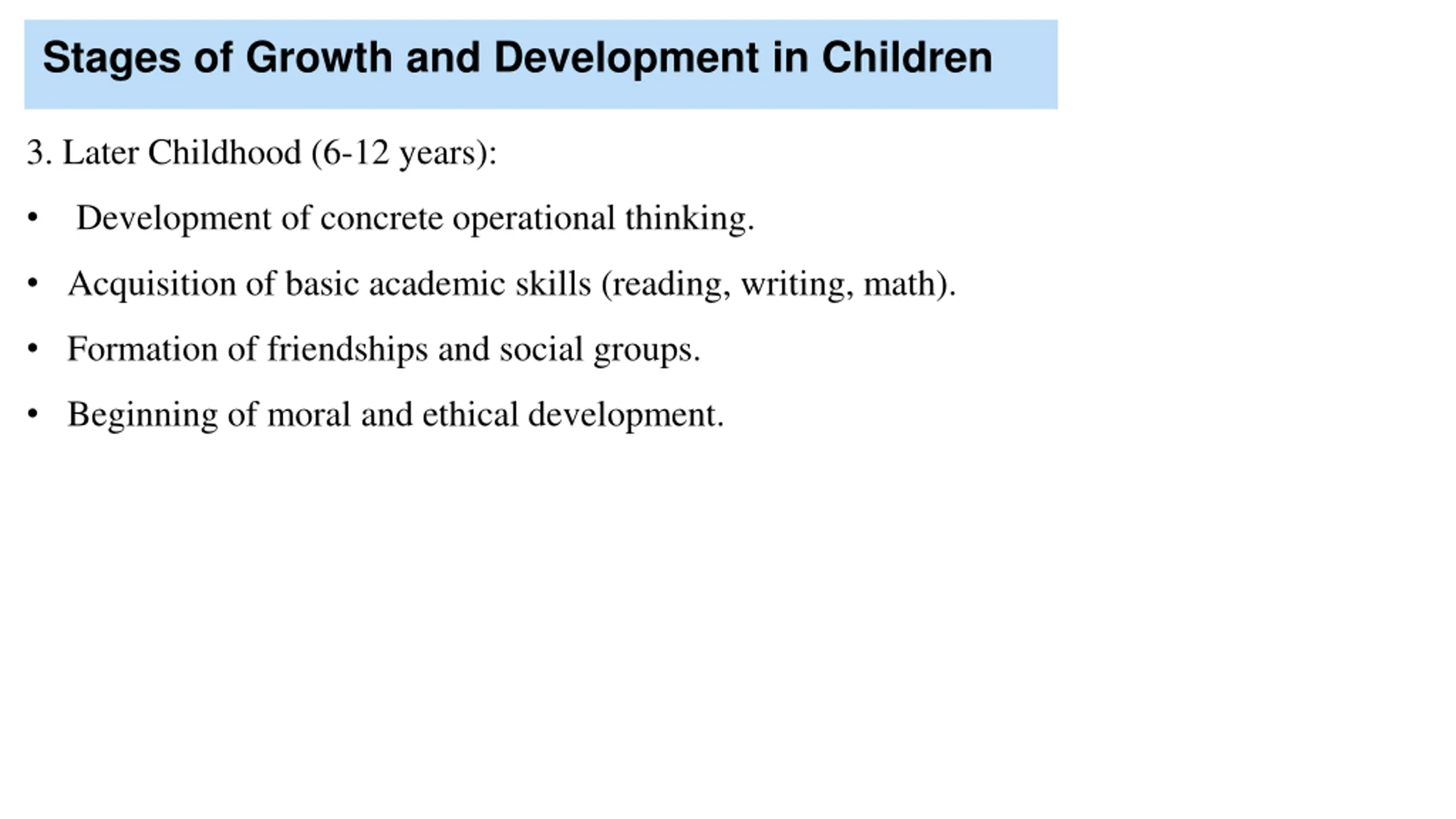 Stages of Growth and Development in Children 3. Later Childhood (6-12 years): Development of concrete operational thinking. Acquisition of basic academic skills (reading, writing, math). Formation of friendships and social groups. Beginning of moral and ethical development.
