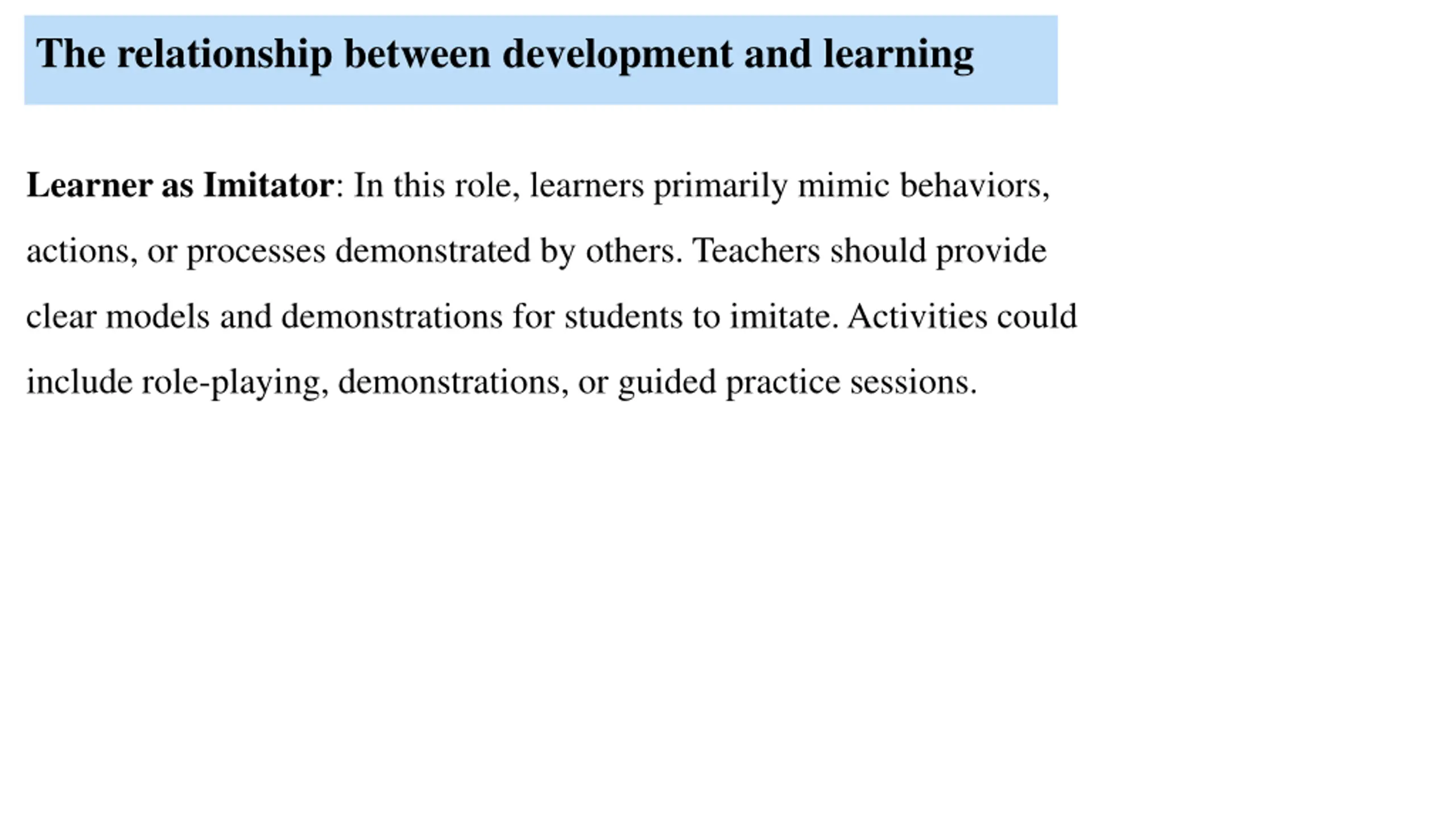 The relationship between development and learning Learner as Imitator: In this role, learners primarily mimic behaviors, actions, or processes demonstrated by others. Teachers should provide clear models and demonstrations for students to imitate. Activities could include role-playing, demonstrations, or guided practice sessions.