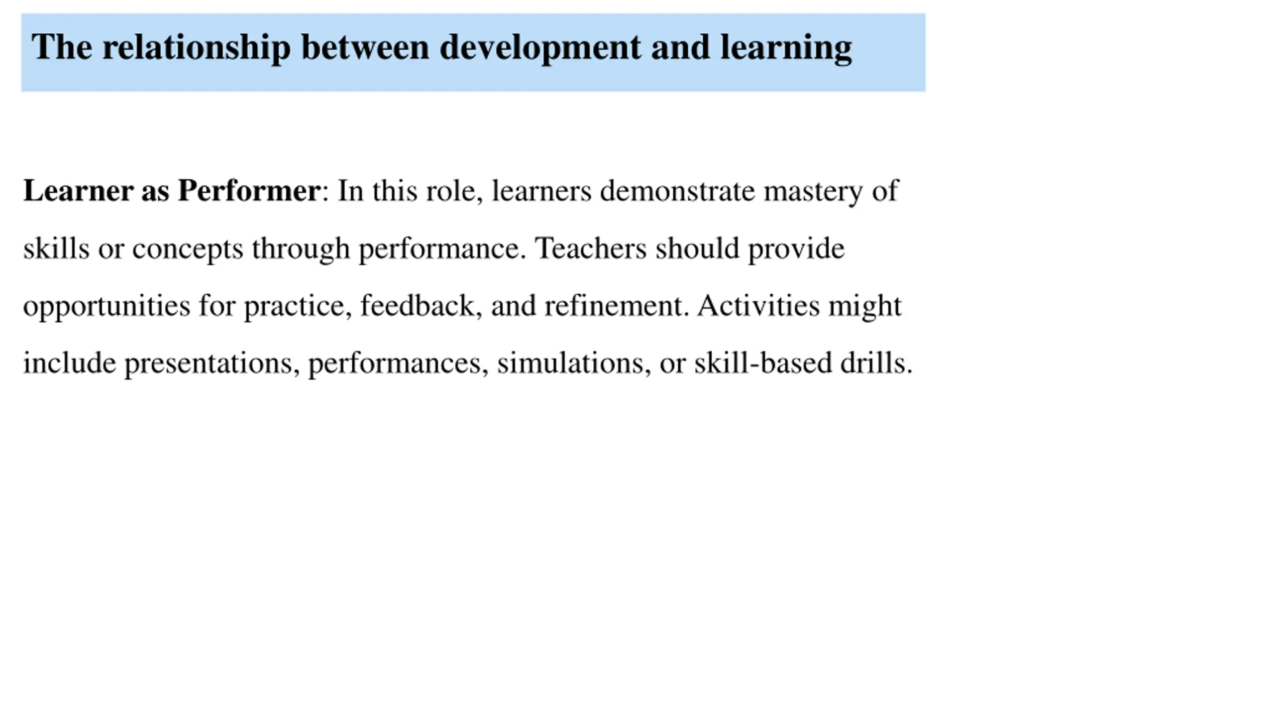 The relationship between development and learning Learner as Performer: In this role, learners demonstrate mastery of skills or concepts through performance. Teachers should provide opportunities for practice, feedback, and refinement. Activities might include presentations, performances, simulations, or skill-based drills.