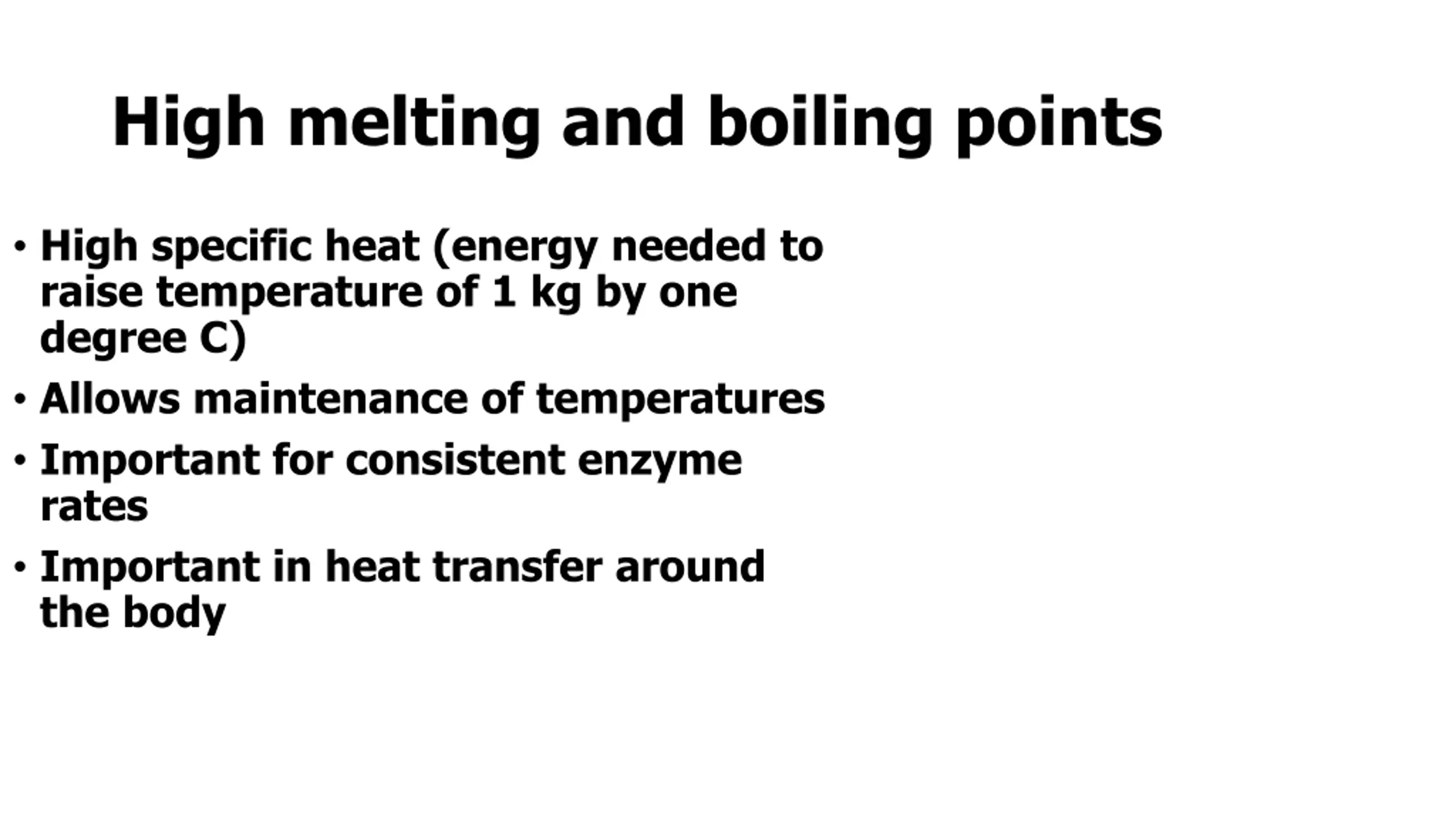High melting and boiling points High specific heat (energy needed to raise temperature of 1 kg by one degree C) Allows maintenance of temperatures Important for consistent enzyme rates Important in heat transfer around the body