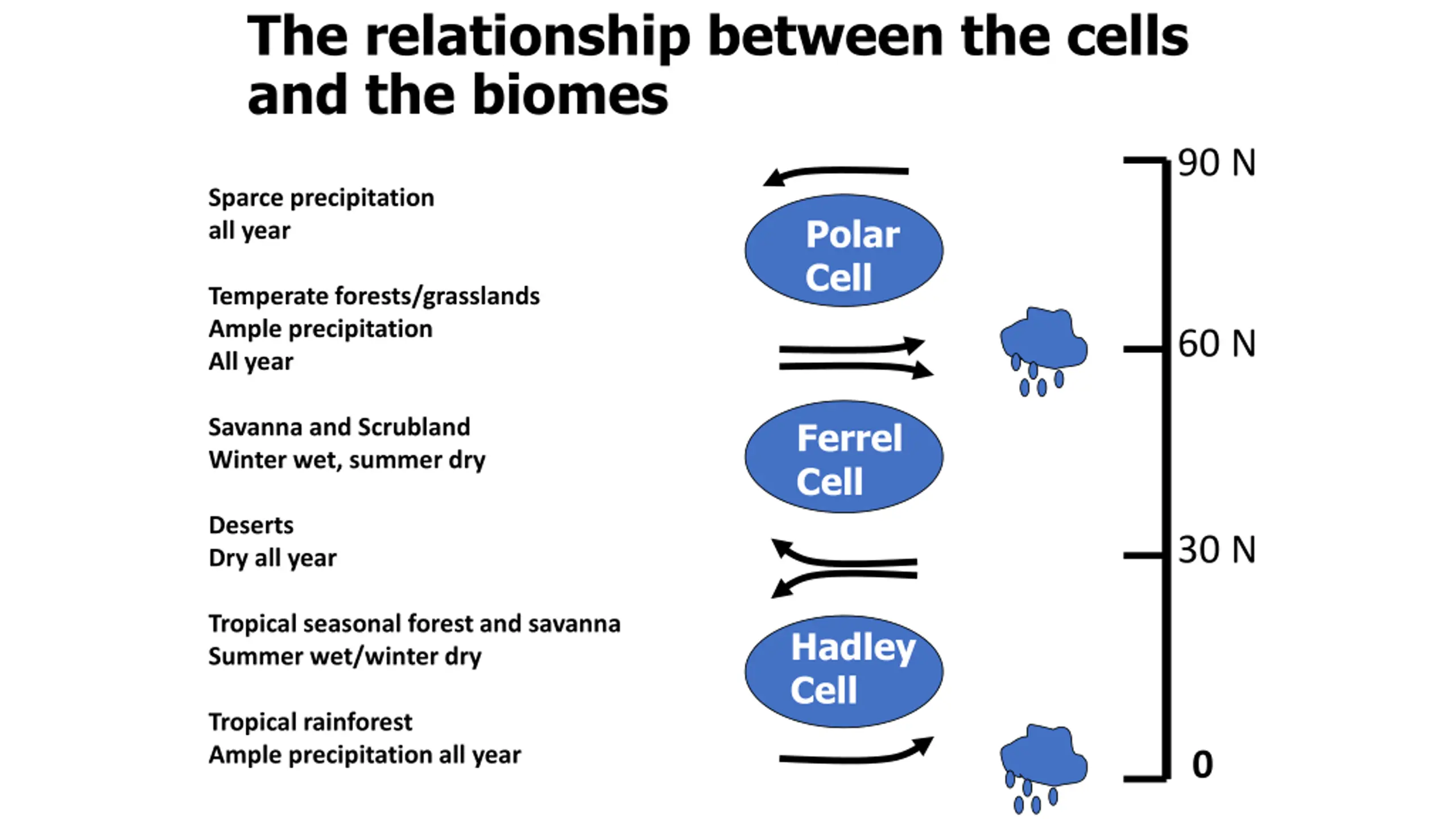 The relationship between the cells and the biomes 90 N Tundra and Taiga Sparce precipitation all year Polar Cell Temperate forests/grasslands Ample precipitation All year 60 N Ferrel Cell Savanna and Scrubland Winter wet, summer dry Deserts Dry all year 30 N Tropical seasonal forest and savanna Summer wet/winter dry Hadley Cell Tropical rainforest Ample precipitation all year 0