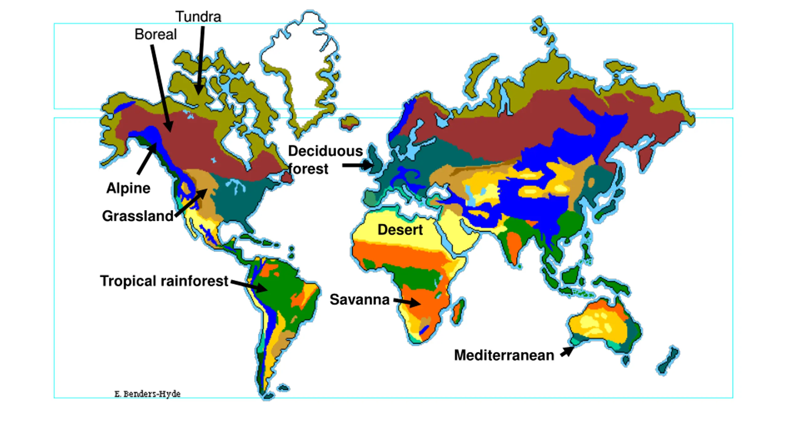 Tundra Boreal Deciduous forest Alpine Grassland Desert Tropical rainforest Savanna Mediterranean