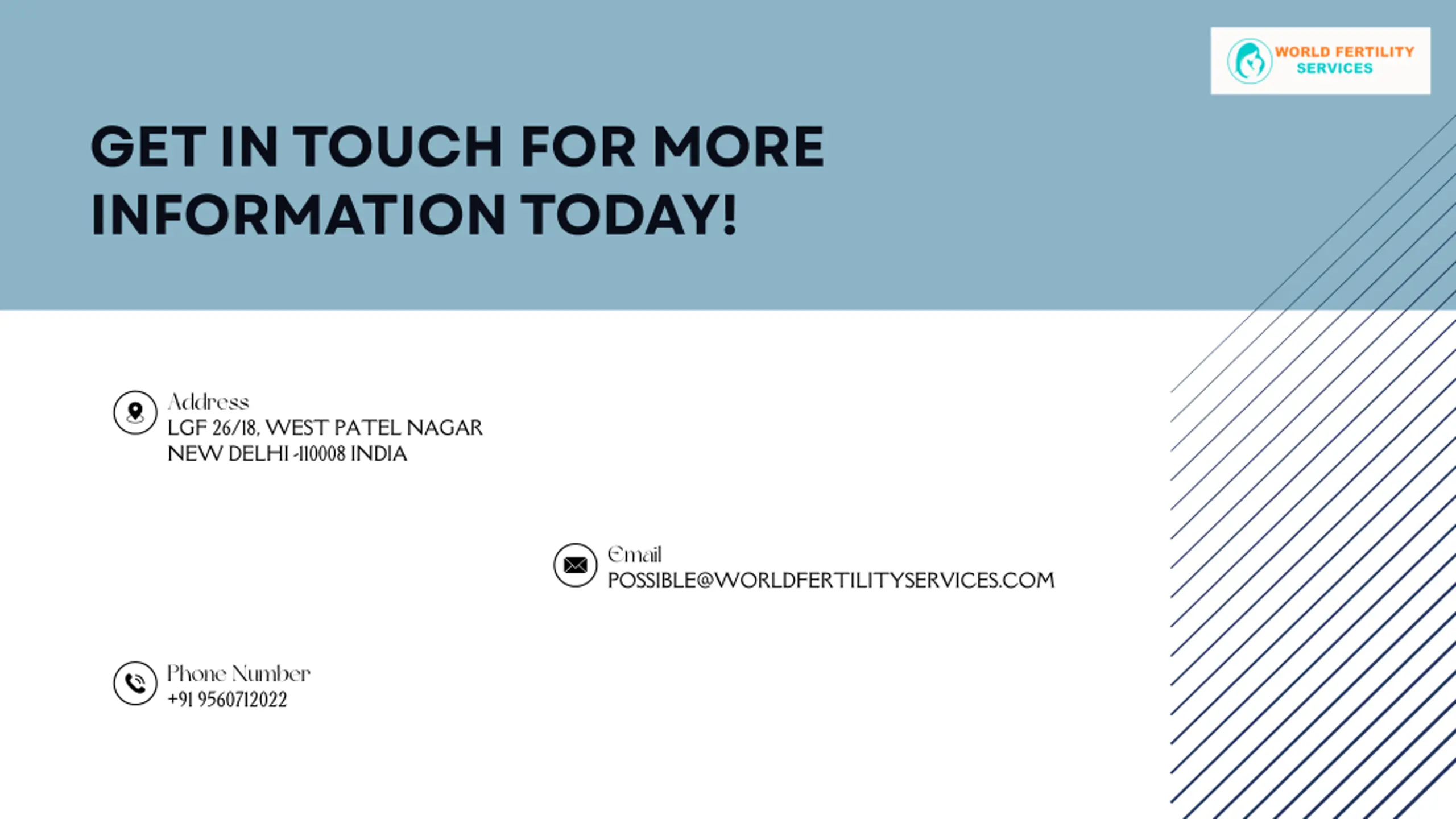 GET IN TOUCH FOR MORE INFORMATION TODAY! Address LGF 26/18, WEST PATEL NAGAR NEW DELHI -110008 INDIA Email POSSIBLE@WORLDFERTILITYSERVICES.COM Phone Number +91 9560712022