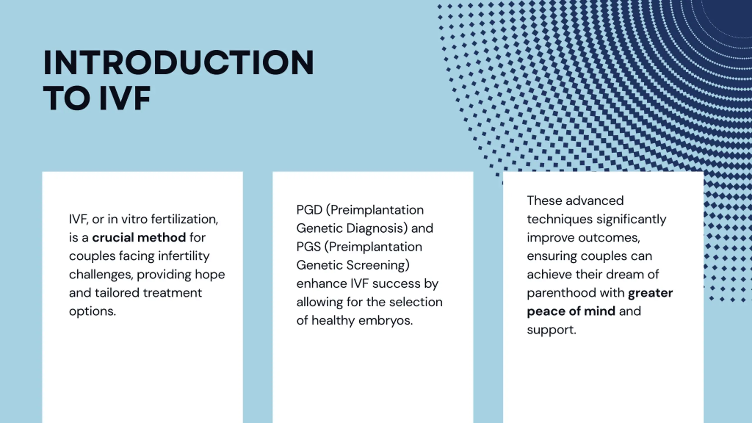INTRODUCTION TO IVF These advanced techniques significantly improve outcomes, ensuring couples can achieve their dream of parenthood with greater peace of mind and support. PGD (Preimplantation Genetic Diagnosis) and PGS (Preimplantation Genetic Screening) enhance IVF success by allowing for the selection of healthy embryos. IVF, or in vitro fertilization, is a crucial method for couples facing infertility challenges, providing hope and tailored treatment options.