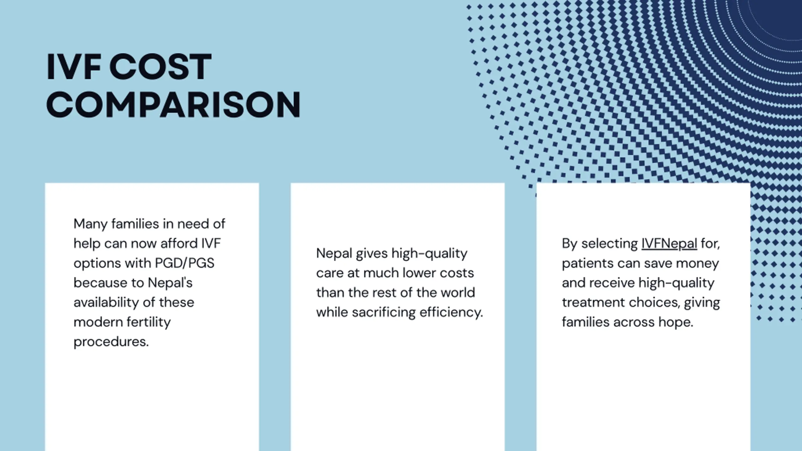 IVF COST COMPARISON Many families in need of help can now afford IVF options with PGD/PGS because to Nepal's availability of these modern fertility procedures. By selecting IVFNepal for, patients can save money and receive high-quality treatment choices, giving families across hope. Nepal gives high-quality care at much lower costs than the rest of the world while sacrificing efficiency.