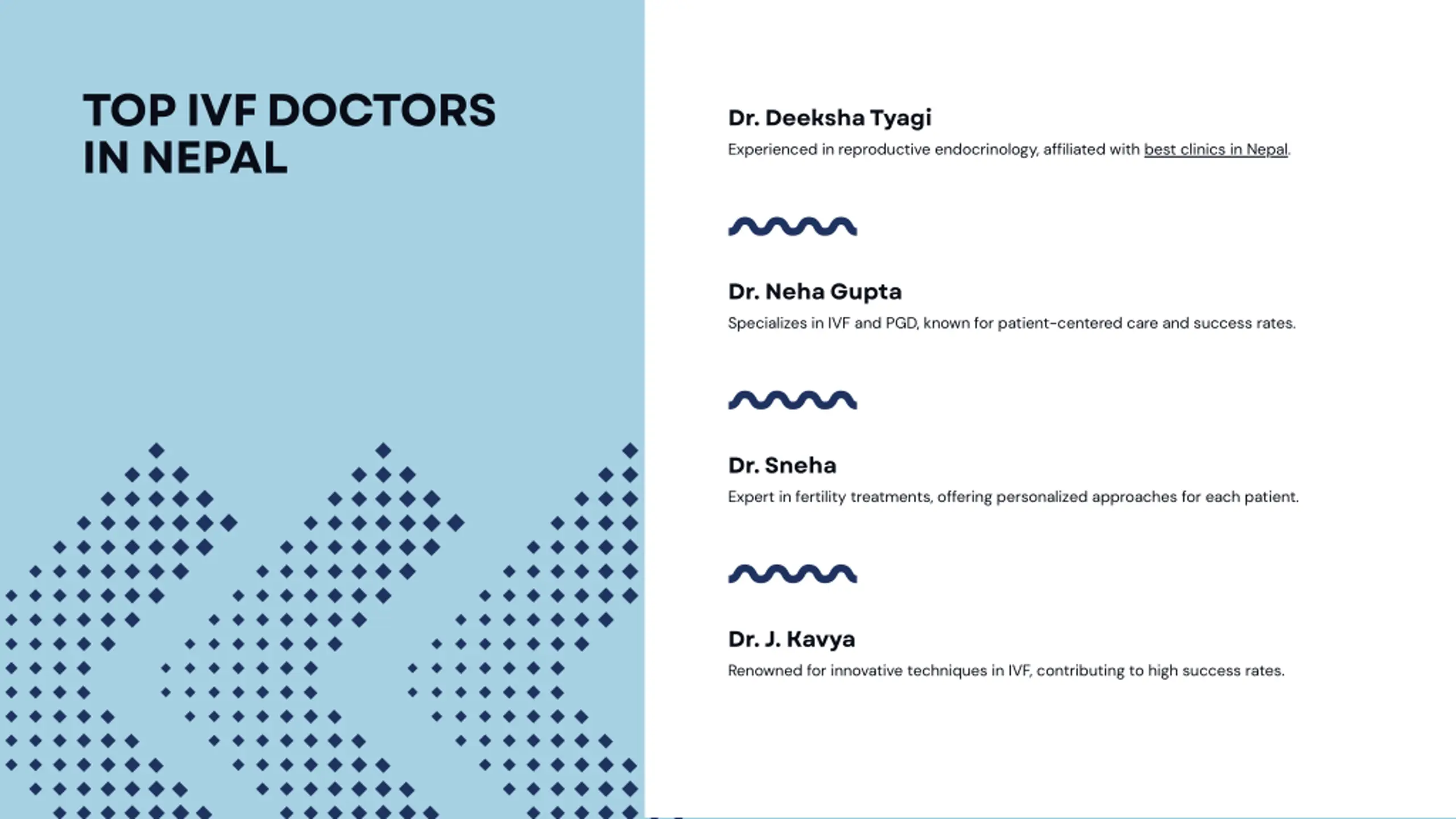 TOP IVF DOCTORS IN NEPAL Dr. Deeksha Tyagi Experienced in reproductive endocrinology, affiliated with best clinics in Nepal. Dr. Neha Gupta Specializes in IVF and PGD, known for patient-centered care and success rates. Dr. Sneha Expert in fertility treatments, offering personalized approaches for each patient. Dr. J. Kavya Renowned for innovative techniques in IVF, contributing to high success rates.
