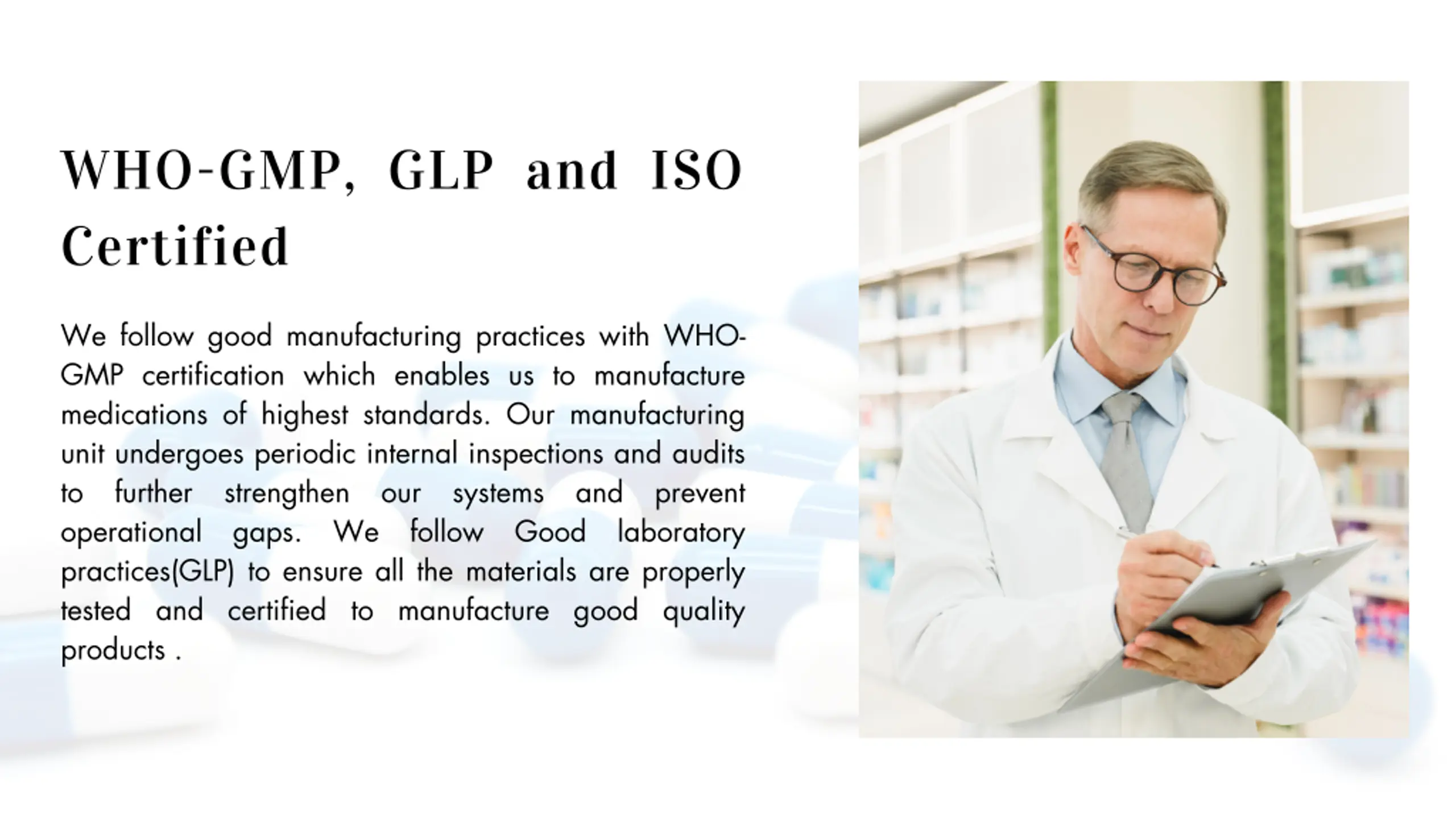 WHO-GMP, GLP and ISO Certified We follow good manufacturing practices with WHO- GMP certification which enables us to manufacture medications of highest standards. Our manufacturing unit undergoes periodic internal inspections and audits to further strengthen our systems and prevent operational gaps. We follow Good laboratory practices(GLP) to ensure all the materials are properly tested and certified to manufacture good quality products .