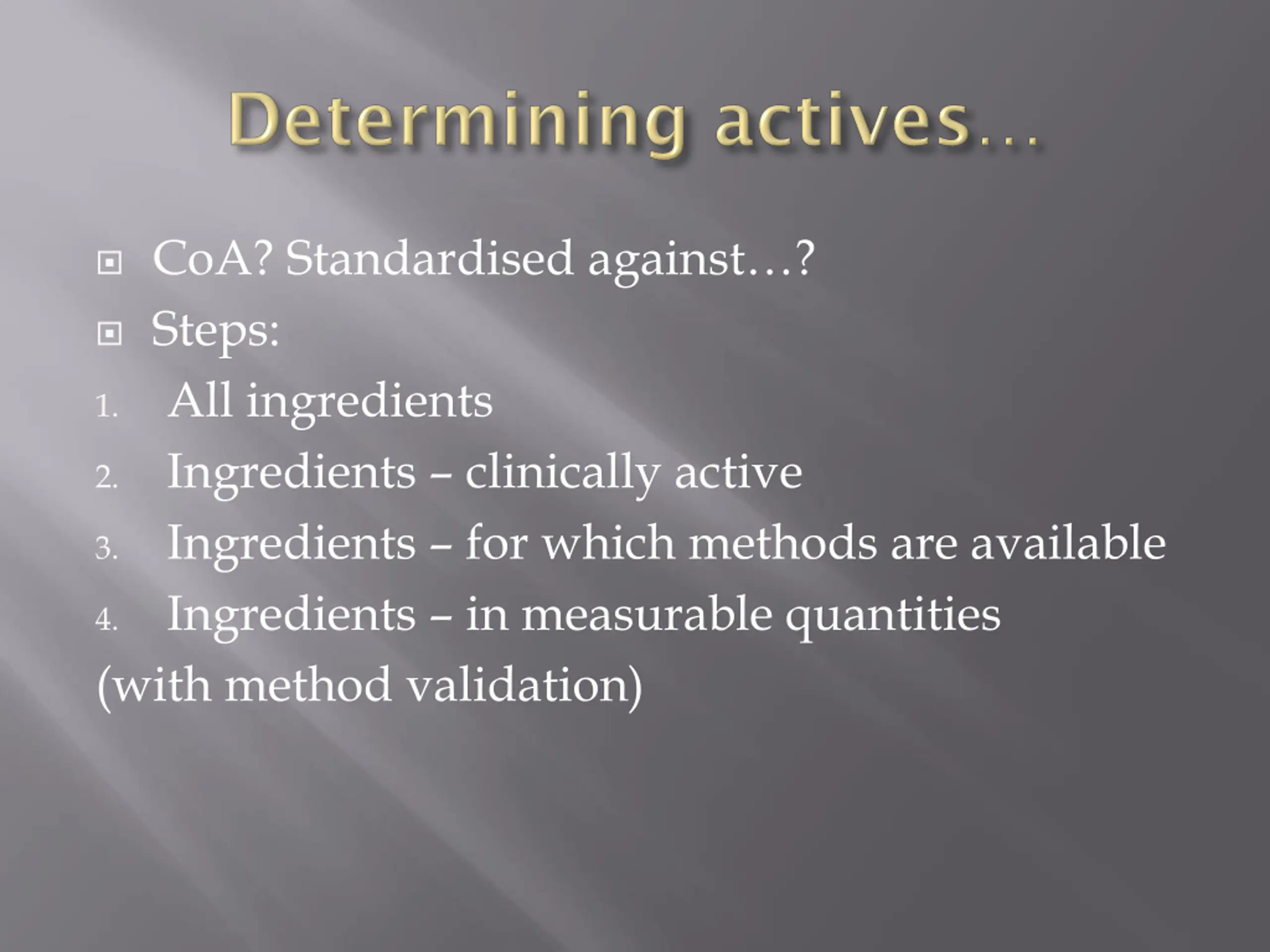 CoA? Standardised against? Steps: All ingredients Ingredients clinically active Ingredients for which methods are available Ingredients in measurable quantities (with method validation) 1. 2. 3. 4.