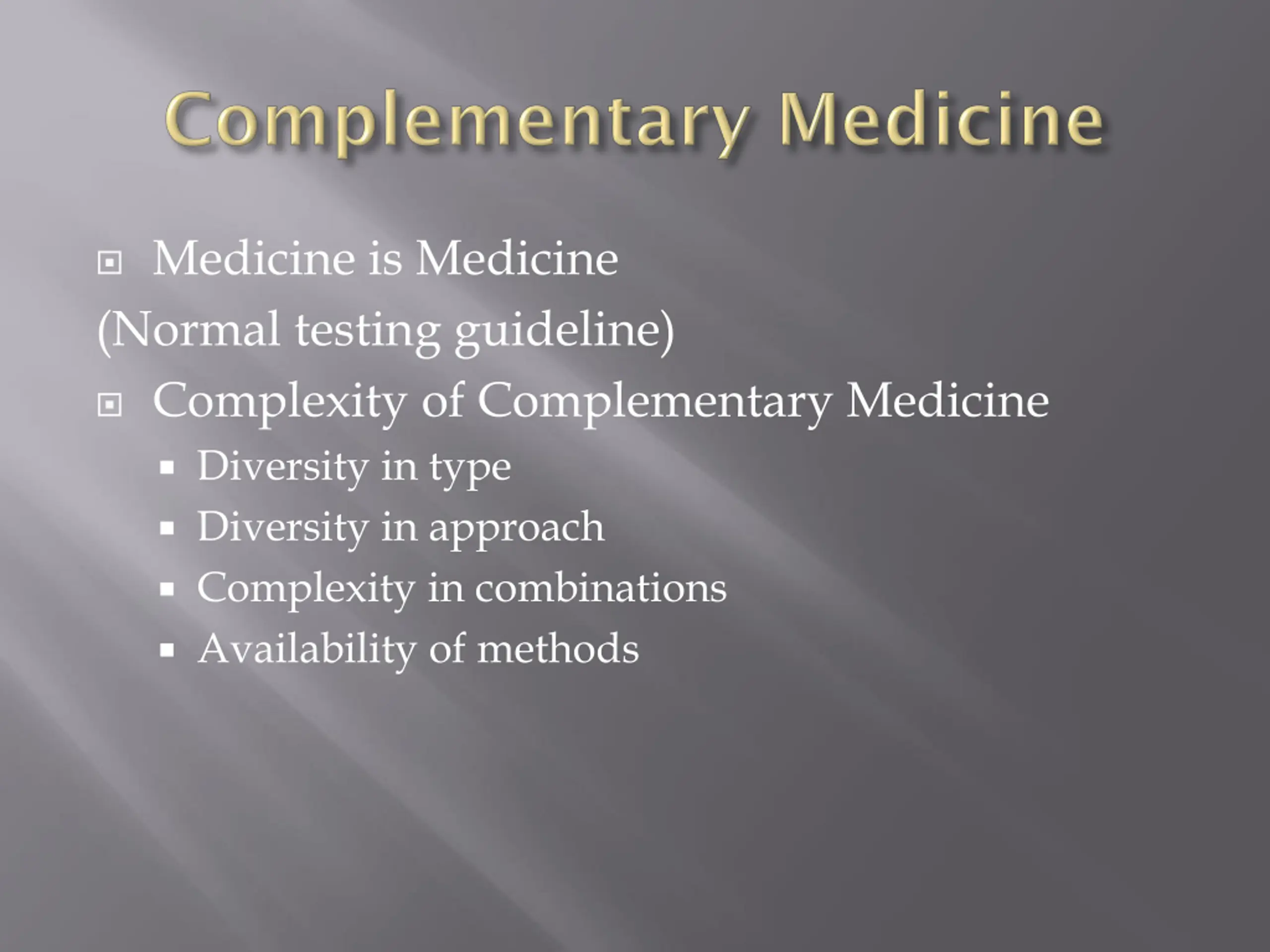 Medicine is Medicine (Normal testing guideline) Complexity of Complementary Medicine Diversity in type Diversity in approach Complexity in combinations Availability of methods