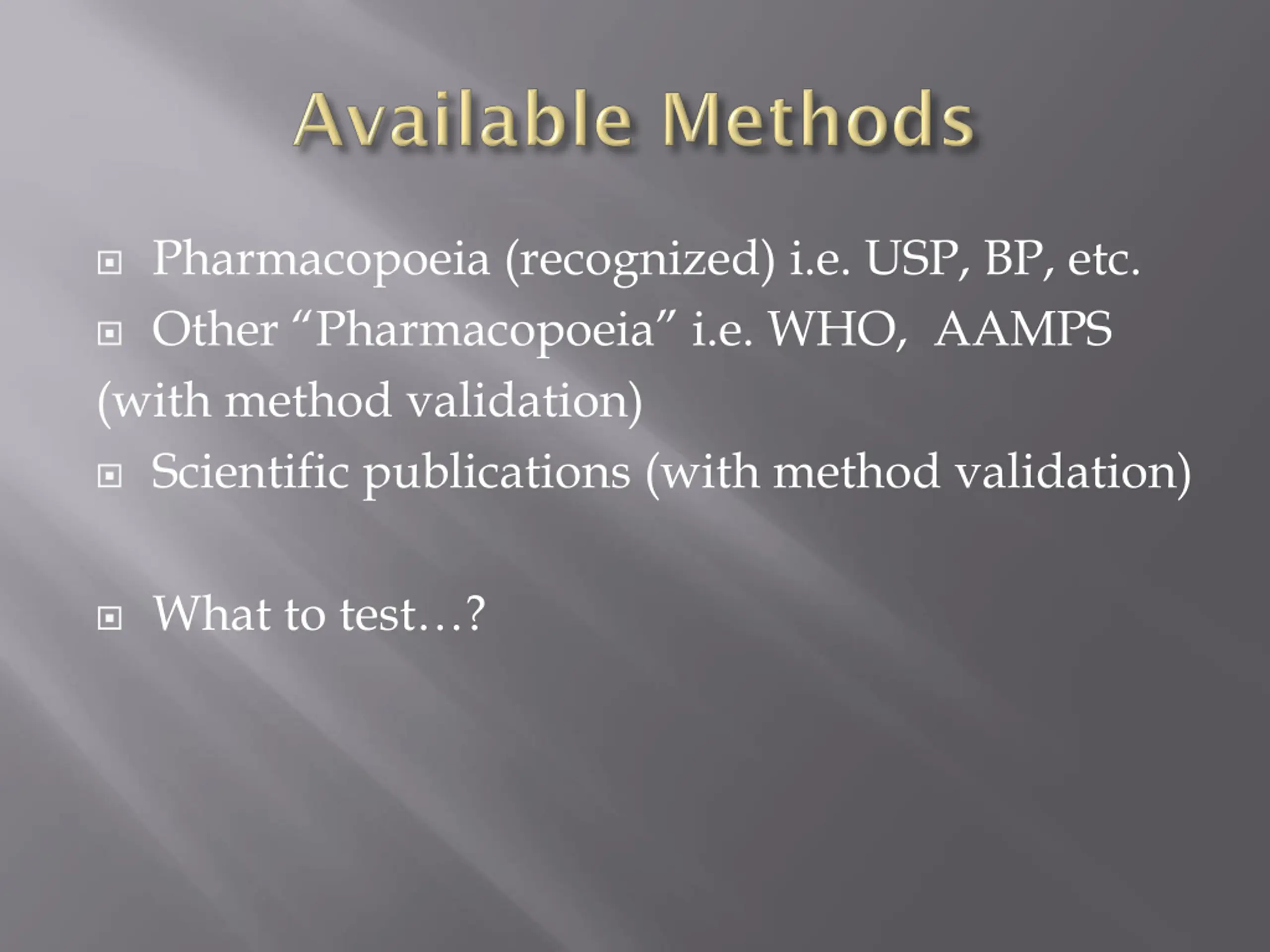 Pharmacopoeia (recognized) i.e. USP, BP, etc. Other Pharmacopoeia i.e. WHO, AAMPS (with method validation) Scientific publications (with method validation) What to test ?