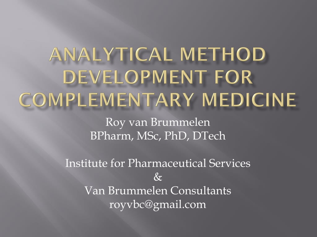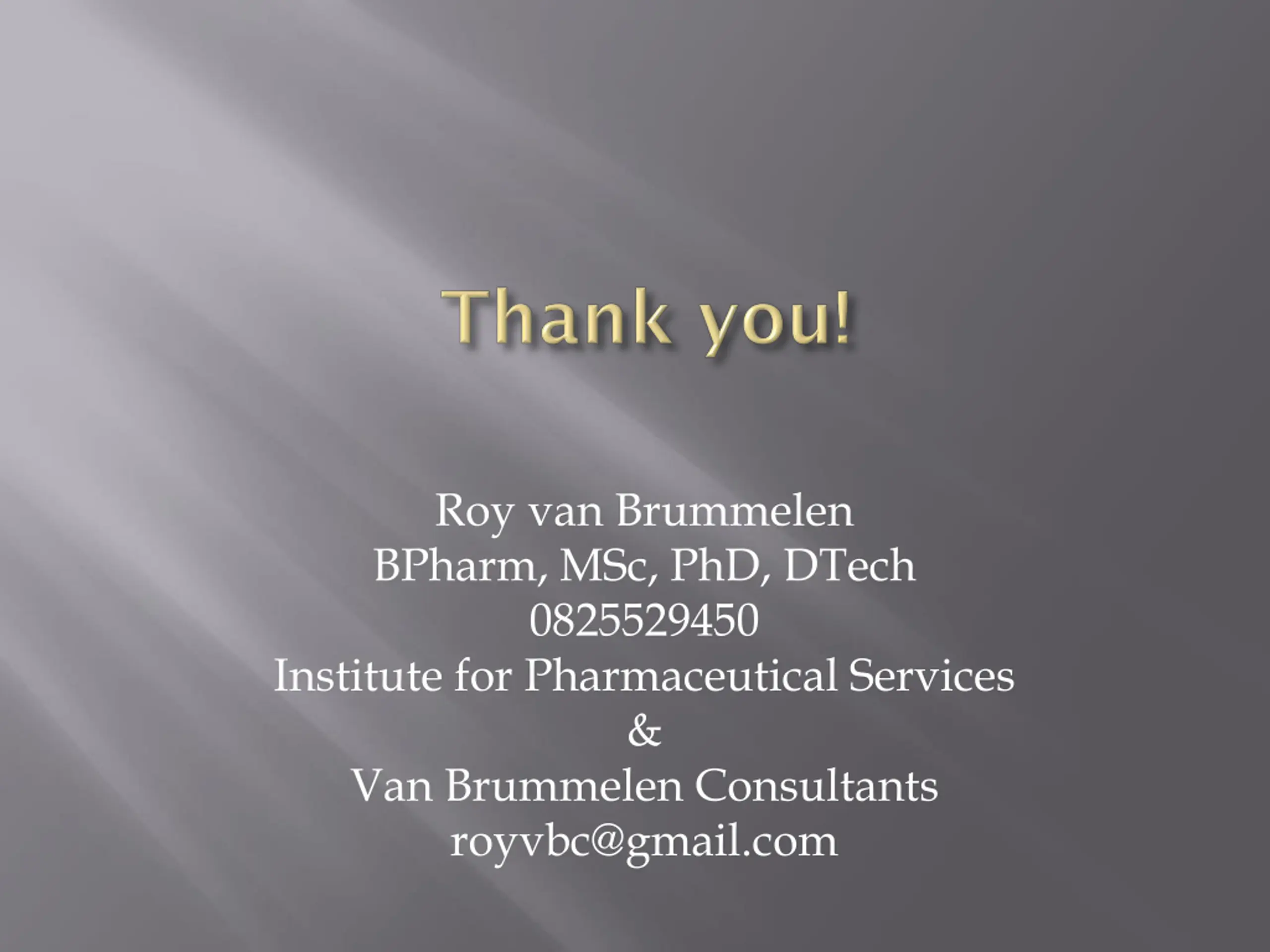 Roy van Brummelen BPharm, MSc, PhD, DTech 0825529450 Institute for Pharmaceutical Services & Van Brummelen Consultants royvbc@gmail.com