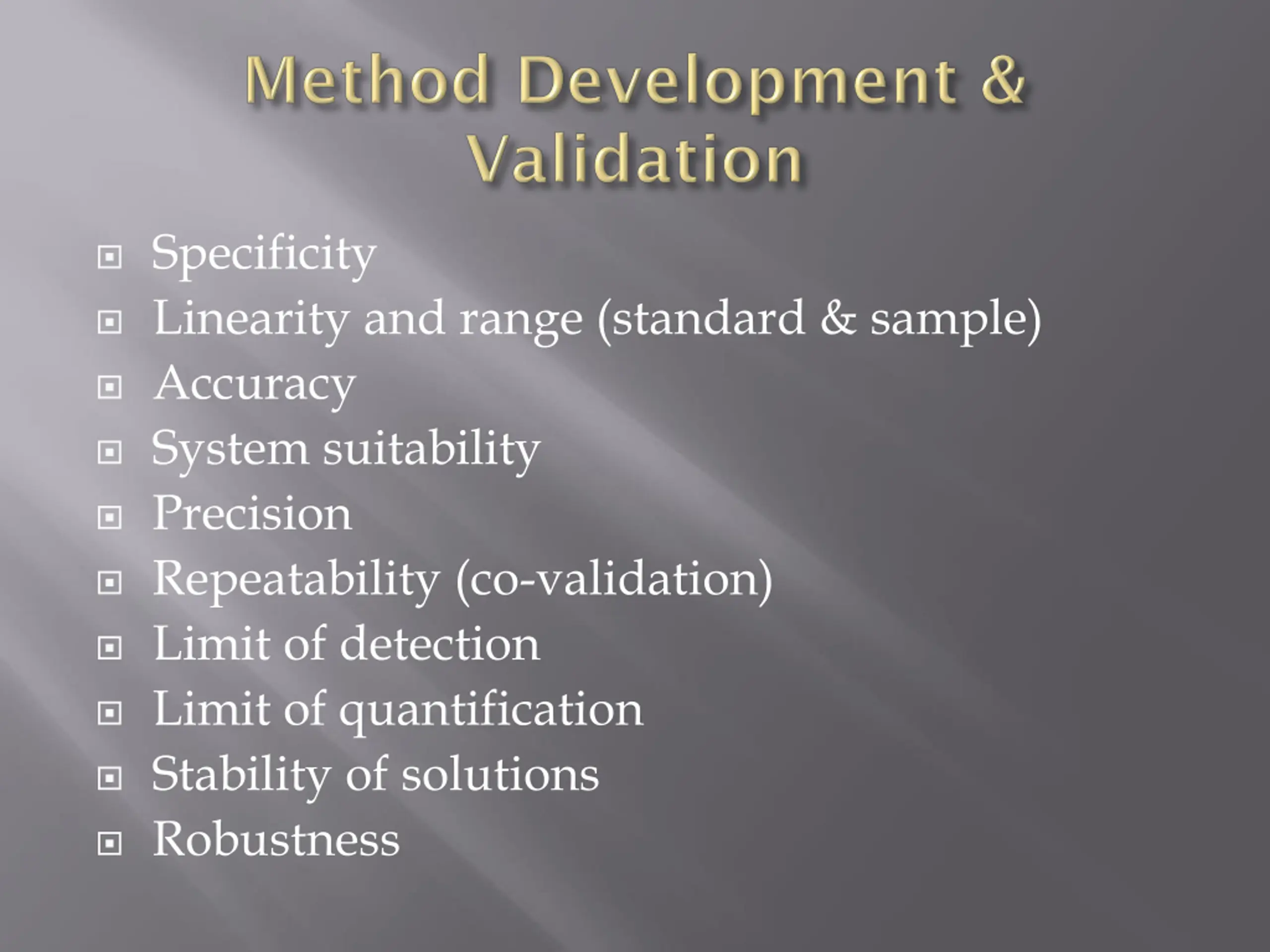 Specificity Linearity and range (standard & sample) Accuracy System suitability Precision Repeatability (co-validation) Limit of detection Limit of quantification Stability of solutions Robustness