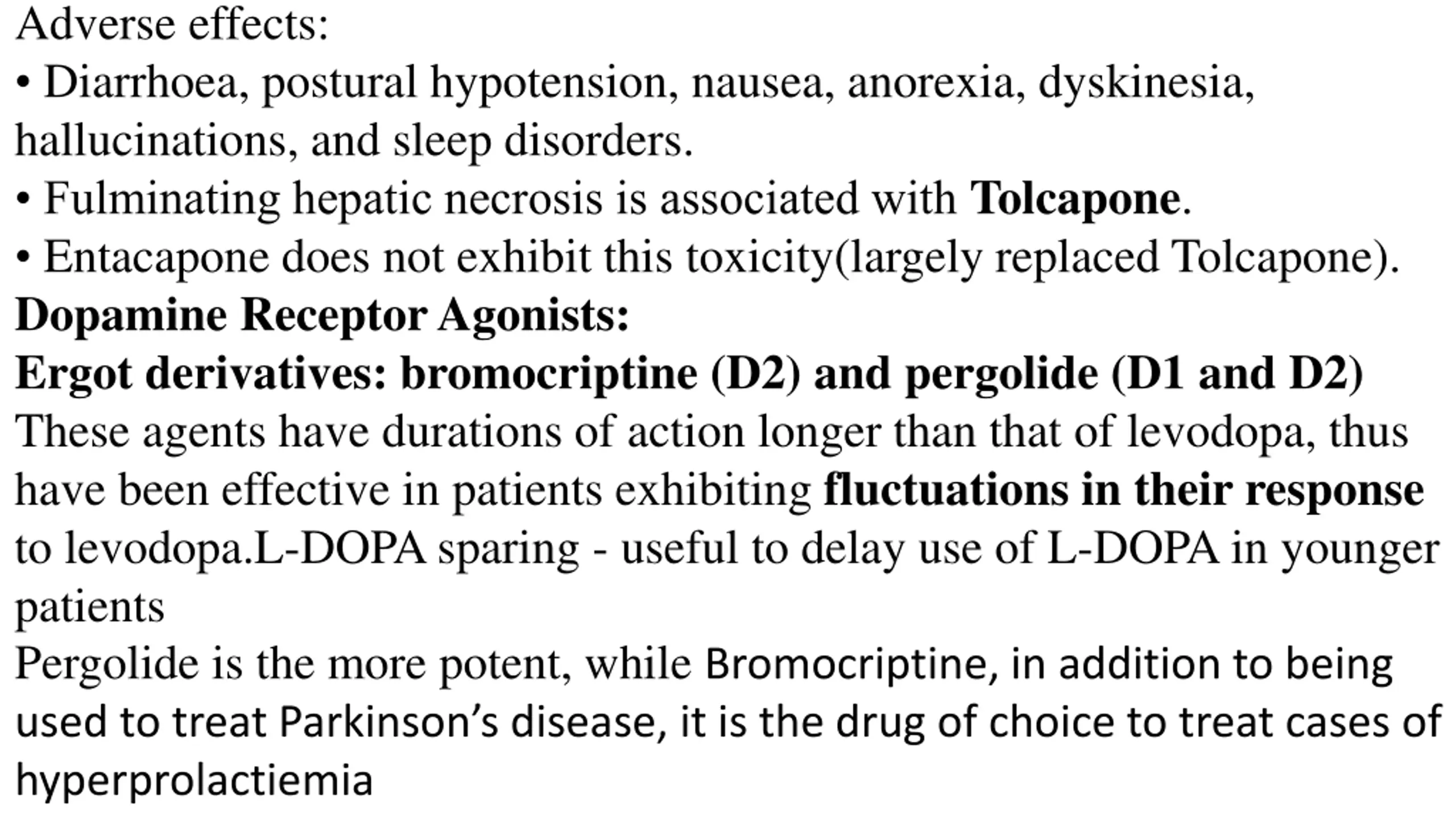 Adverse effects: Diarrhoea, postural hypotension, nausea, anorexia, dyskinesia, hallucinations, and sleep disorders. Fulminating hepatic necrosis is associated with Tolcapone. Entacapone does not exhibit this toxicity(largely replaced Tolcapone). Dopamine Receptor Agonists: Ergot derivatives: bromocriptine (D2) and pergolide (D1 and D2) These agents have durations of action longer than that of levodopa, thus have been effective in patients exhibiting fluctuations in their response to levodopa.L-DOPA sparing - useful to delay use of L-DOPA in younger patients Pergolide is the more potent, while Bromocriptine, in addition to being used to treat Parkinson s disease, it is the drug of choice to treat cases of hyperprolactiemia