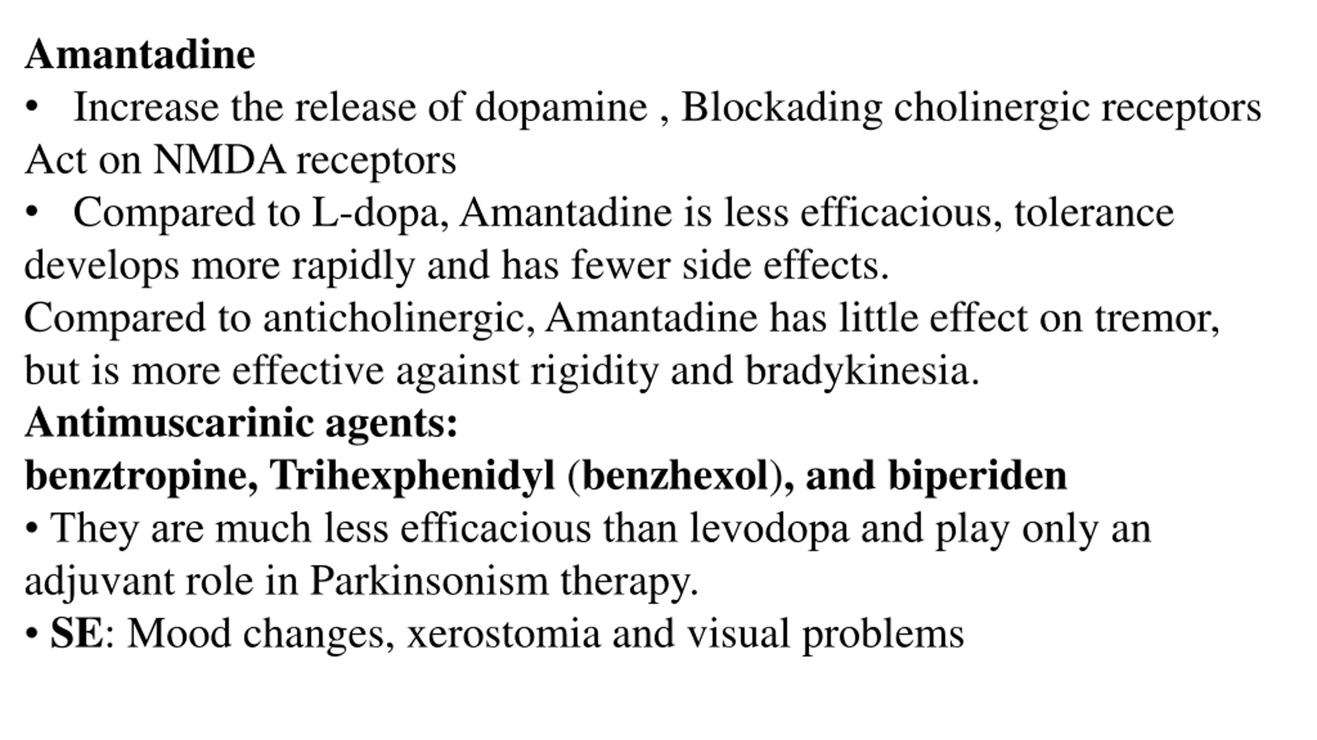 Amantadine Increase the release of dopamine , Blockading cholinergic receptors Act on NMDA receptors Compared to L-dopa, Amantadine is less efficacious, tolerance develops more rapidly and has fewer side effects. Compared to anticholinergic, Amantadine has little effect on tremor, but is more effective against rigidity and bradykinesia. Antimuscarinic agents: benztropine, Trihexphenidyl (benzhexol), and biperiden They are much less efficacious than levodopa and play only an adjuvant role in Parkinsonism therapy. SE: Mood changes, xerostomia and visual problems