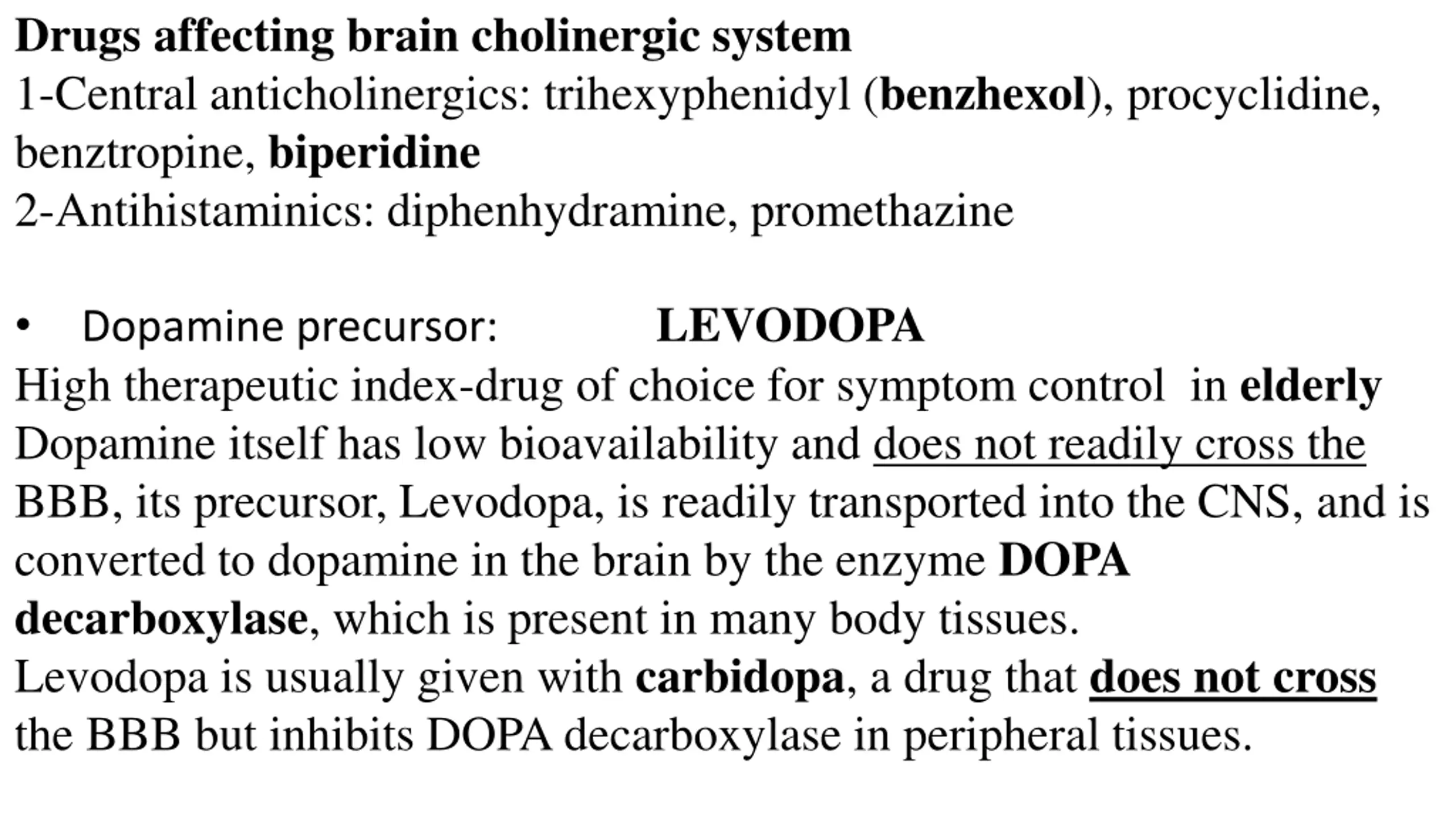 Drugs affecting brain cholinergic system 1-Central anticholinergics: trihexyphenidyl (benzhexol), procyclidine, benztropine, biperidine 2-Antihistaminics: diphenhydramine, promethazine Dopamine precursor:LEVODOPA High therapeutic index-drug of choice for symptom control in elderly Dopamine itself has low bioavailability and does not readily cross the BBB, its precursor, Levodopa, is readily transported into the CNS, and is converted to dopamine in the brain by the enzyme DOPA decarboxylase, which is present in many body tissues. Levodopa is usually given with carbidopa, a drug that does not cross the BBB but inhibits DOPA decarboxylase in peripheral tissues.