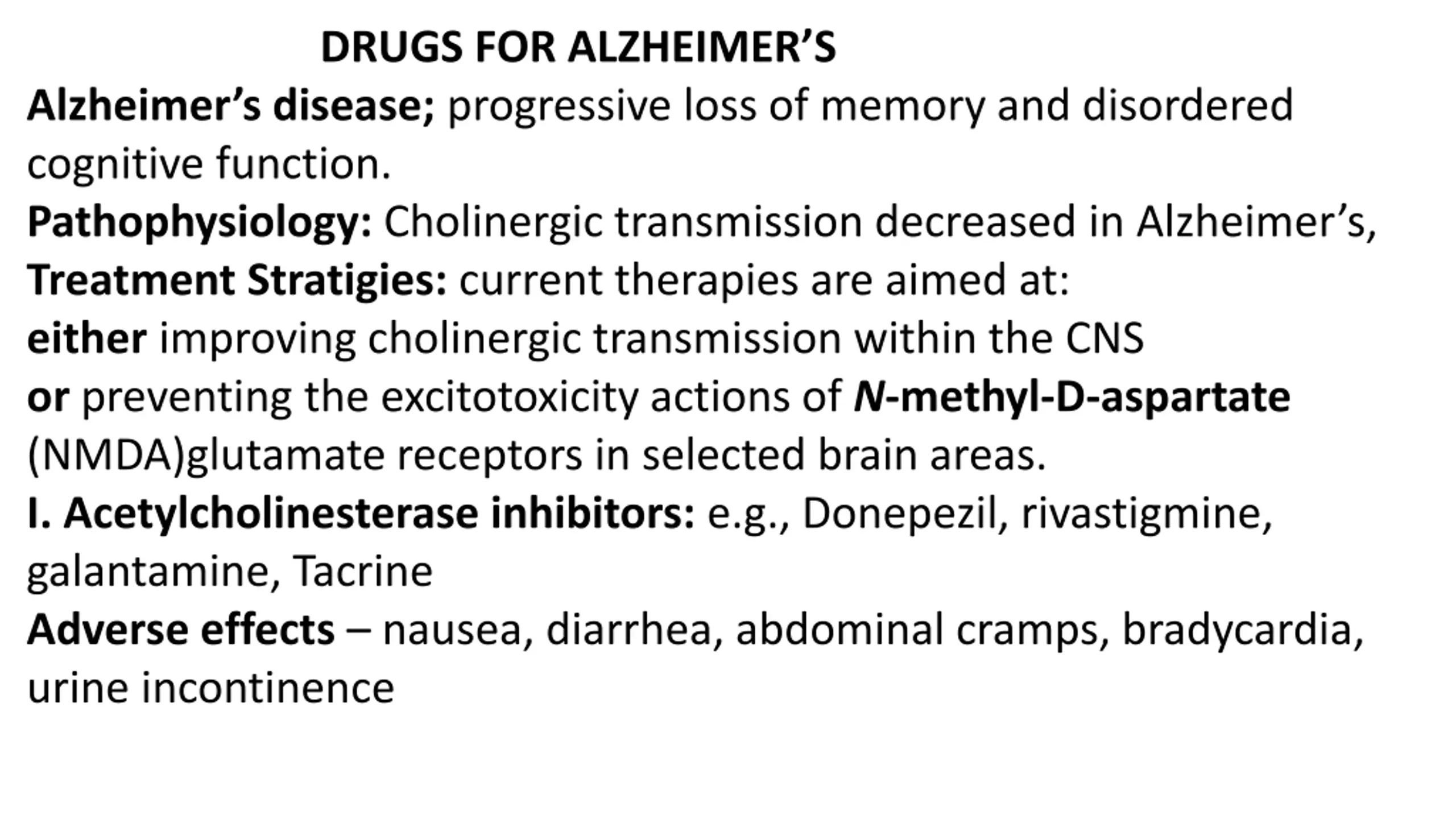 DRUGS FOR ALZHEIMERS Alzheimer s disease; progressive loss of memory and disordered cognitive function. Pathophysiology: Cholinergic transmission decreased in Alzheimer s, Treatment Stratigies: current therapies are aimed at: either improving cholinergic transmission within the CNS or preventing the excitotoxicity actions of N-methyl-D-aspartate (NMDA)glutamate receptors in selected brain areas. I. Acetylcholinesterase inhibitors: e.g., Donepezil, rivastigmine, galantamine, Tacrine Adverse effects nausea, diarrhea, abdominal cramps, bradycardia, urine incontinence