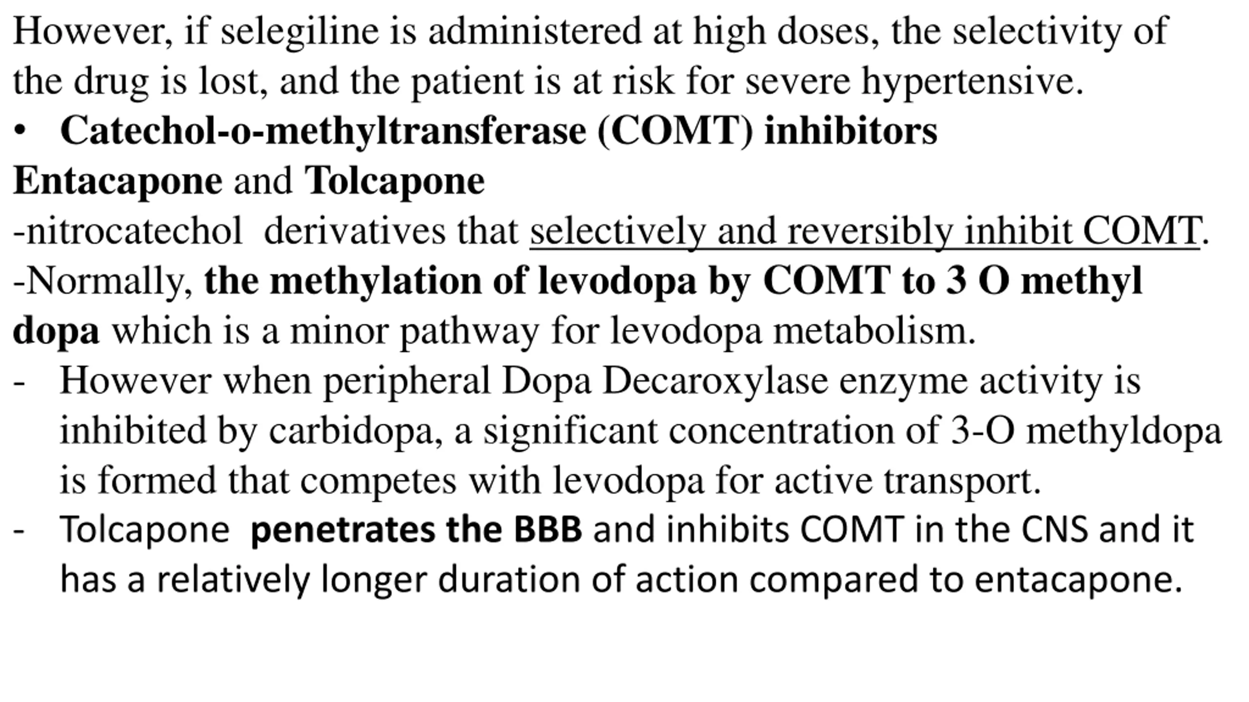 However, if selegiline is administered at high doses, the selectivity of the drug is lost, and the patient is at risk for severe hypertensive. Catechol-o-methyltransferase (COMT) inhibitors Entacapone and Tolcapone -nitrocatechol derivatives that selectively and reversibly inhibit COMT. -Normally, the methylation of levodopa by COMT to 3 O methyl dopa which is a minor pathway for levodopa metabolism. - However when peripheral Dopa Decaroxylase enzyme activity is inhibited by carbidopa, a significant concentration of 3-O methyldopa is formed that competes with levodopa for active transport. - Tolcapone penetrates the BBB and inhibits COMT in the CNS and it has a relatively longer duration of action compared to entacapone.