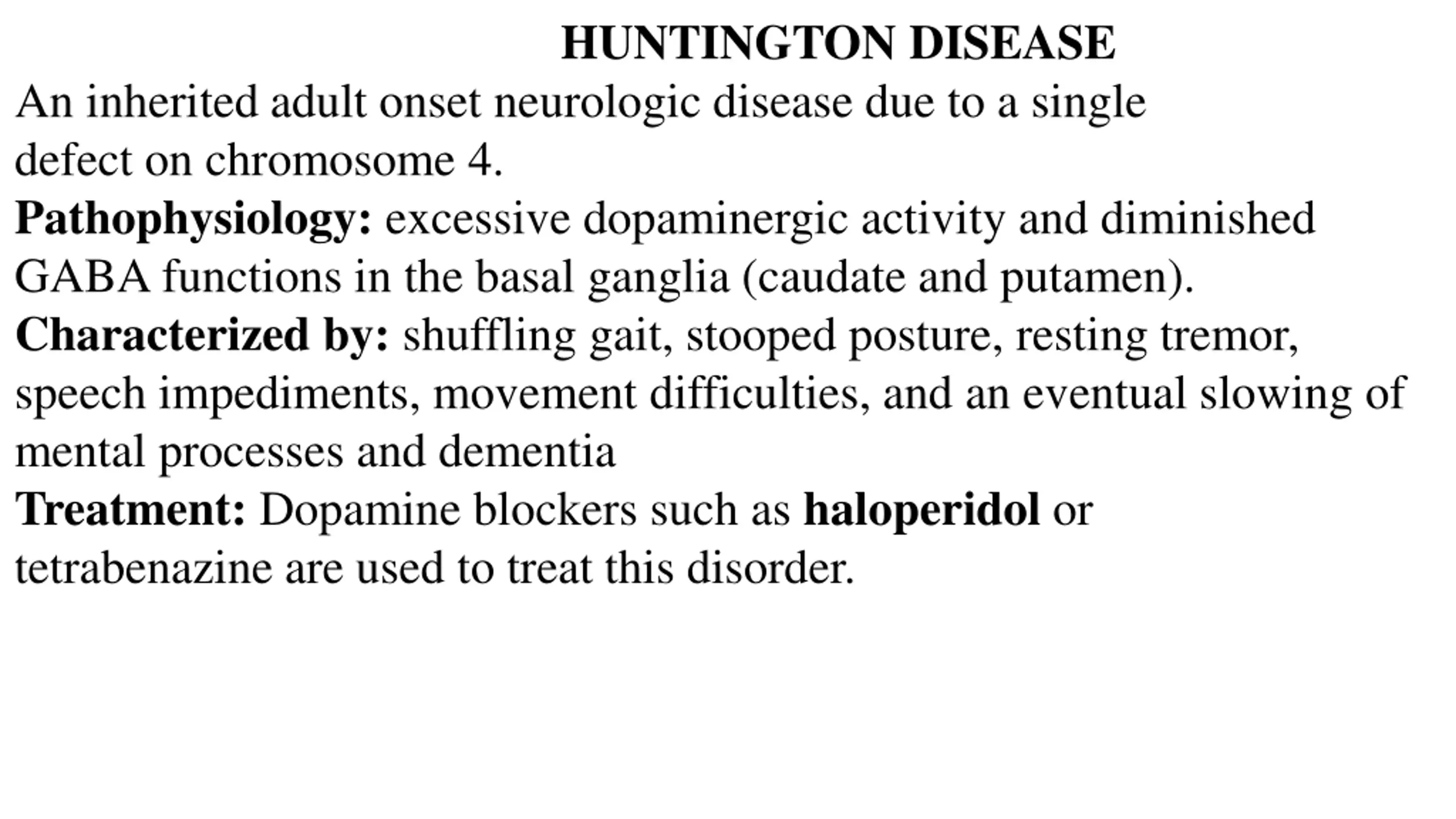 HUNTINGTON DISEASE An inherited adult onset neurologic disease due to a single defect on chromosome 4. Pathophysiology: excessive dopaminergic activity and diminished GABA functions in the basal ganglia (caudate and putamen). Characterized by: shuffling gait, stooped posture, resting tremor, speech impediments, movement difficulties, and an eventual slowing of mental processes and dementia Treatment: Dopamine blockers such as haloperidol or tetrabenazine are used to treat this disorder.