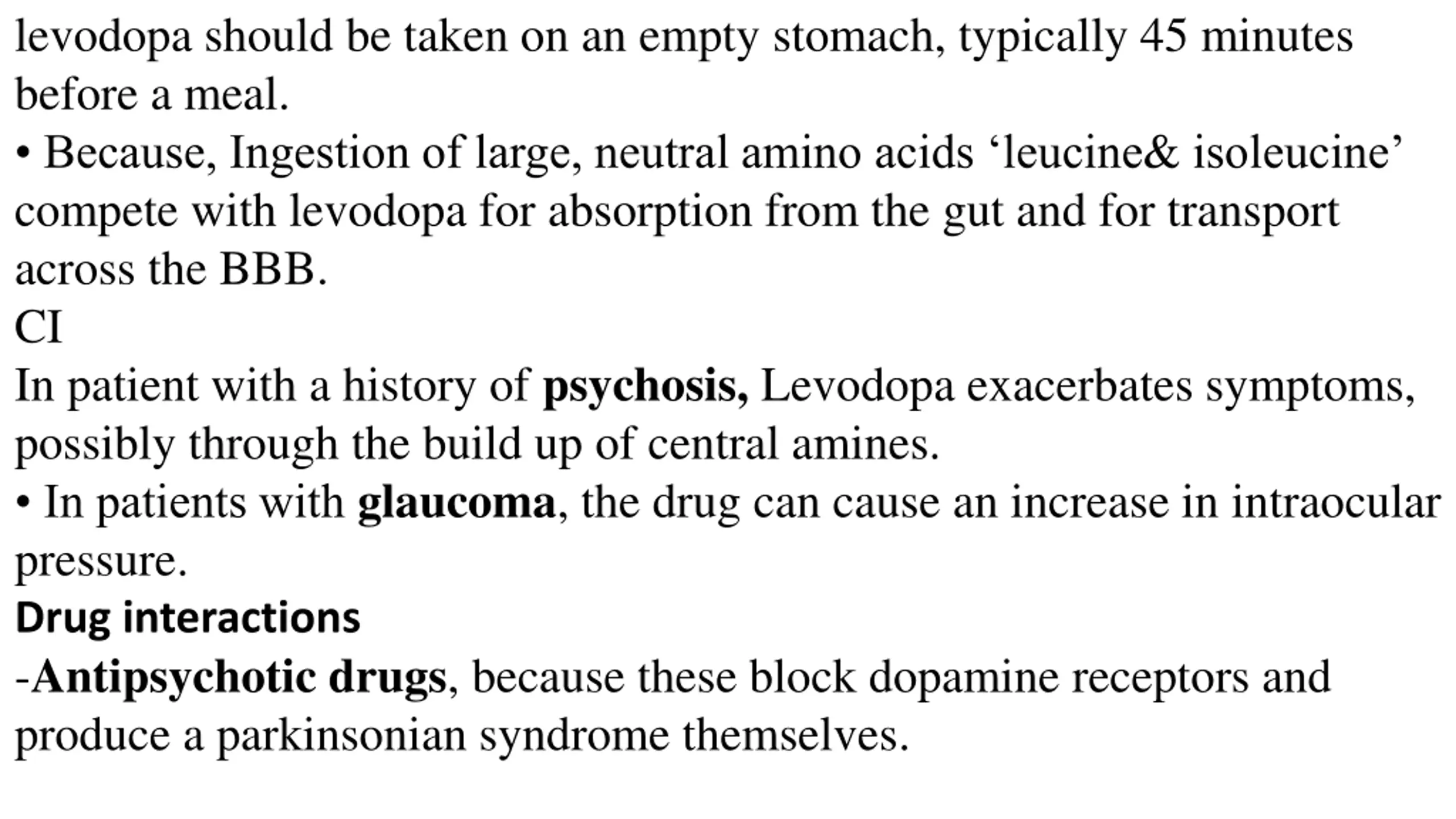 levodopa should be taken on an empty stomach, typically 45 minutes before a meal. Because, Ingestion of large, neutral amino acids leucine& isoleucine compete with levodopa for absorption from the gut and for transport across the BBB. CI In patient with a history of psychosis, Levodopa exacerbates symptoms, possibly through the build up of central amines. In patients with glaucoma, the drug can cause an increase in intraocular pressure. Drug interactions -Antipsychotic drugs, because these block dopamine receptors and produce a parkinsonian syndrome themselves.
