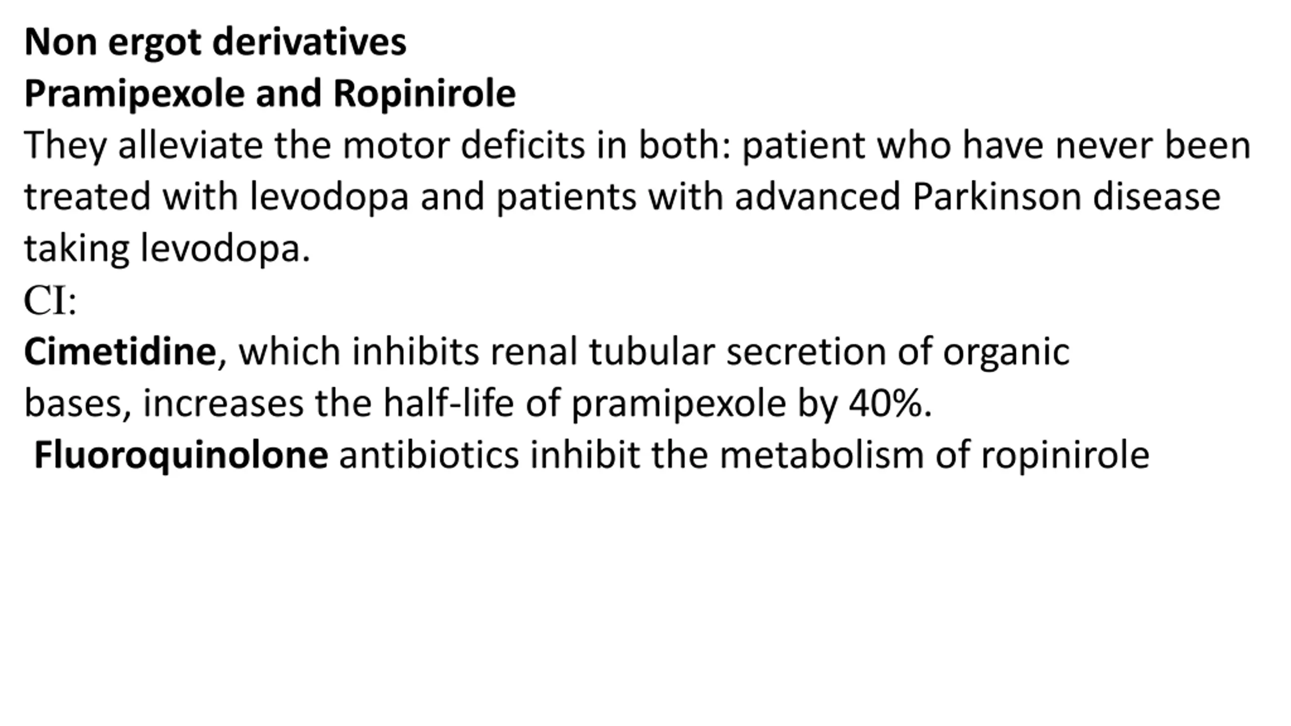 Non ergot derivatives Pramipexole and Ropinirole They alleviate the motor deficits in both: patient who have never been treated with levodopa and patients with advanced Parkinson disease taking levodopa. CI: Cimetidine, which inhibits renal tubular secretion of organic bases, increases the half-life of pramipexole by 40%. Fluoroquinolone antibiotics inhibit the metabolism of ropinirole