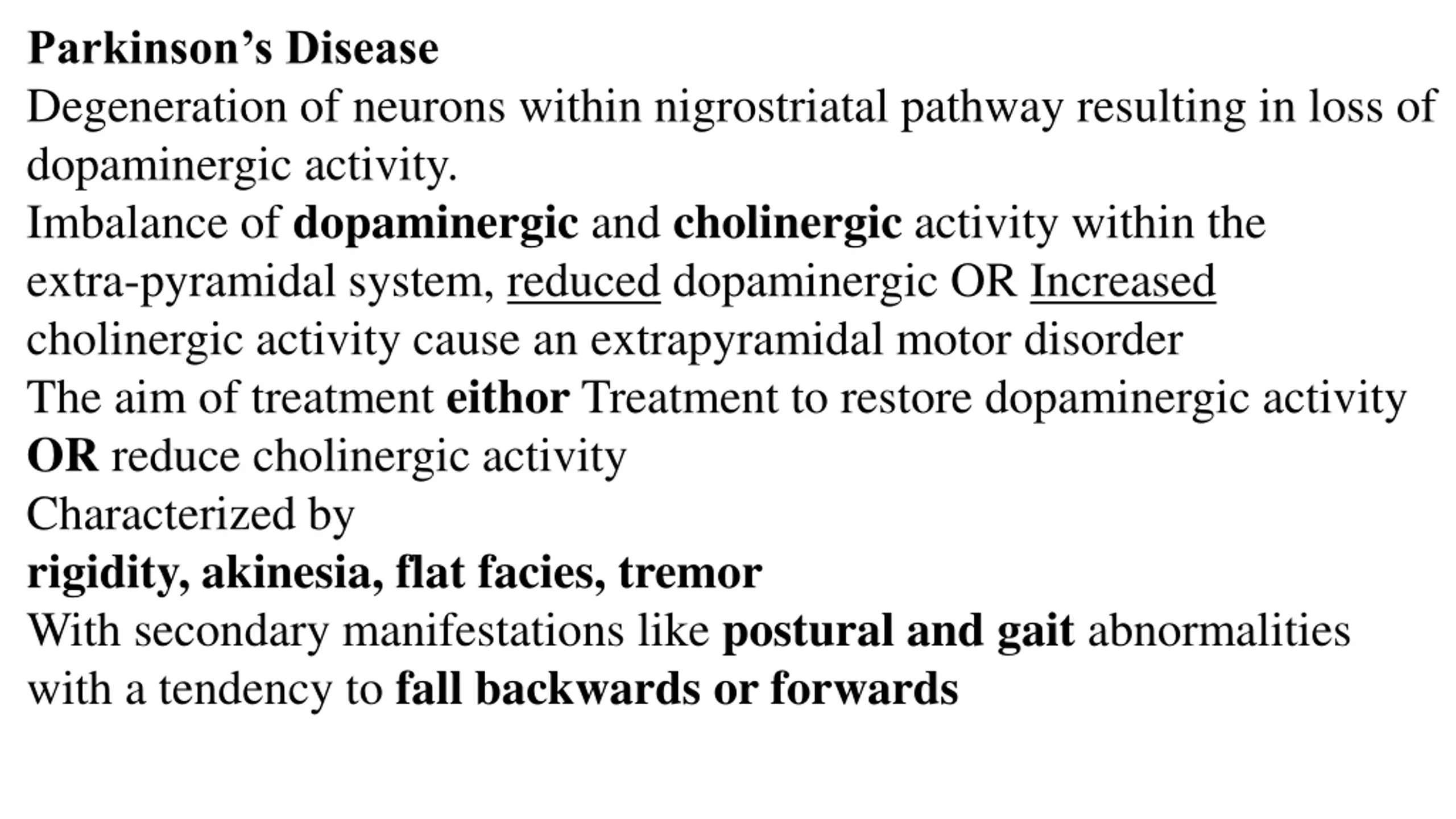 Parkinsons Disease Degeneration of neurons within nigrostriatal pathway resulting in loss of dopaminergic activity. Imbalance of dopaminergic and cholinergic activity within the extra-pyramidal system, reduced dopaminergic OR Increased cholinergic activity cause an extrapyramidal motor disorder The aim of treatment eithor Treatment to restore dopaminergic activity OR reduce cholinergic activity Characterized by rigidity, akinesia, flat facies, tremor With secondary manifestations like postural and gait abnormalities with a tendency to fall backwards or forwards