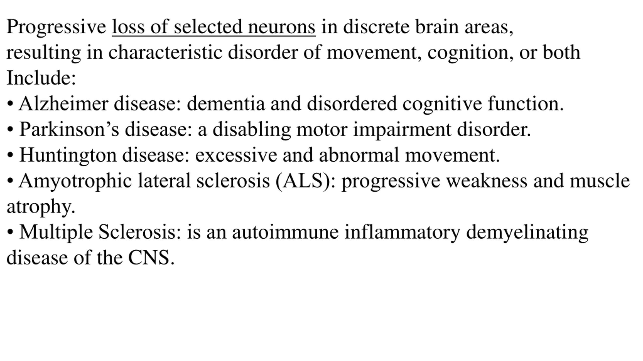 Progressive loss of selected neurons in discrete brain areas, resulting in characteristic disorder of movement, cognition, or both Include: Alzheimer disease: dementia and disordered cognitive function. Parkinson s disease: a disabling motor impairment disorder. Huntington disease: excessive and abnormal movement. Amyotrophic lateral sclerosis (ALS): progressive weakness and muscle atrophy. Multiple Sclerosis: is an autoimmune inflammatory demyelinating disease of the CNS.